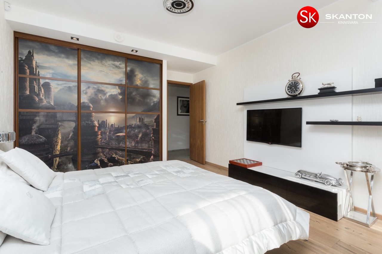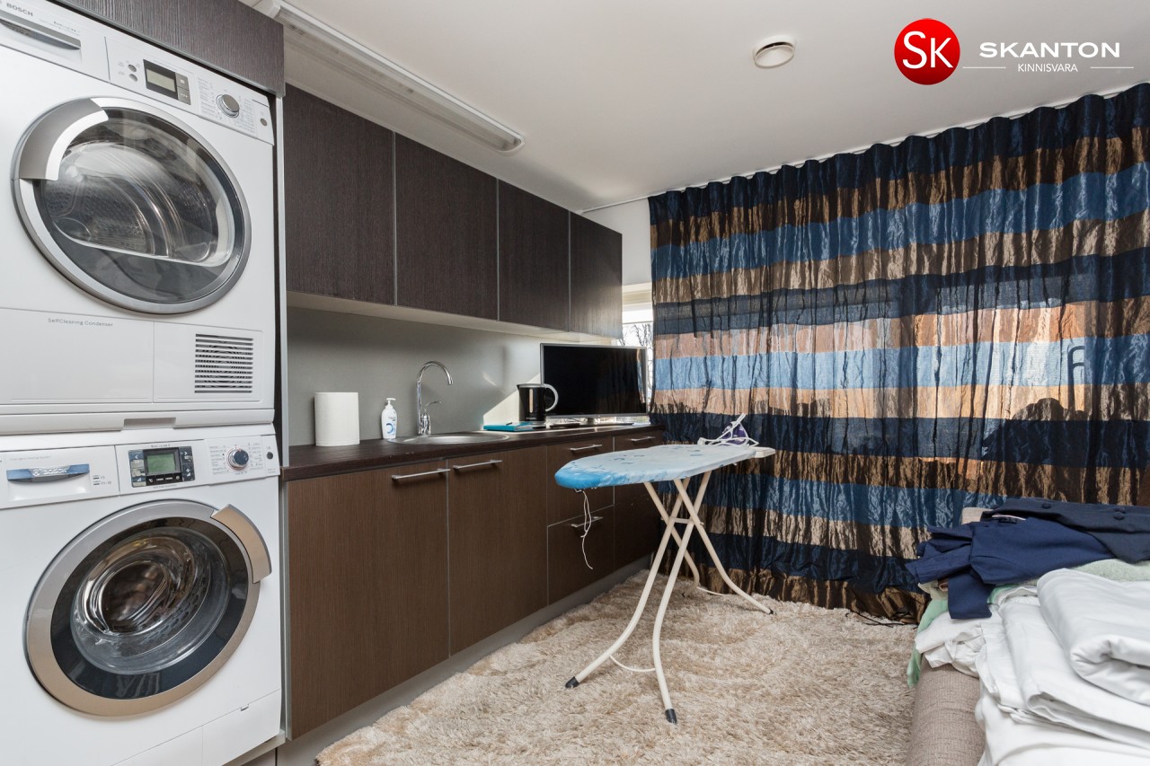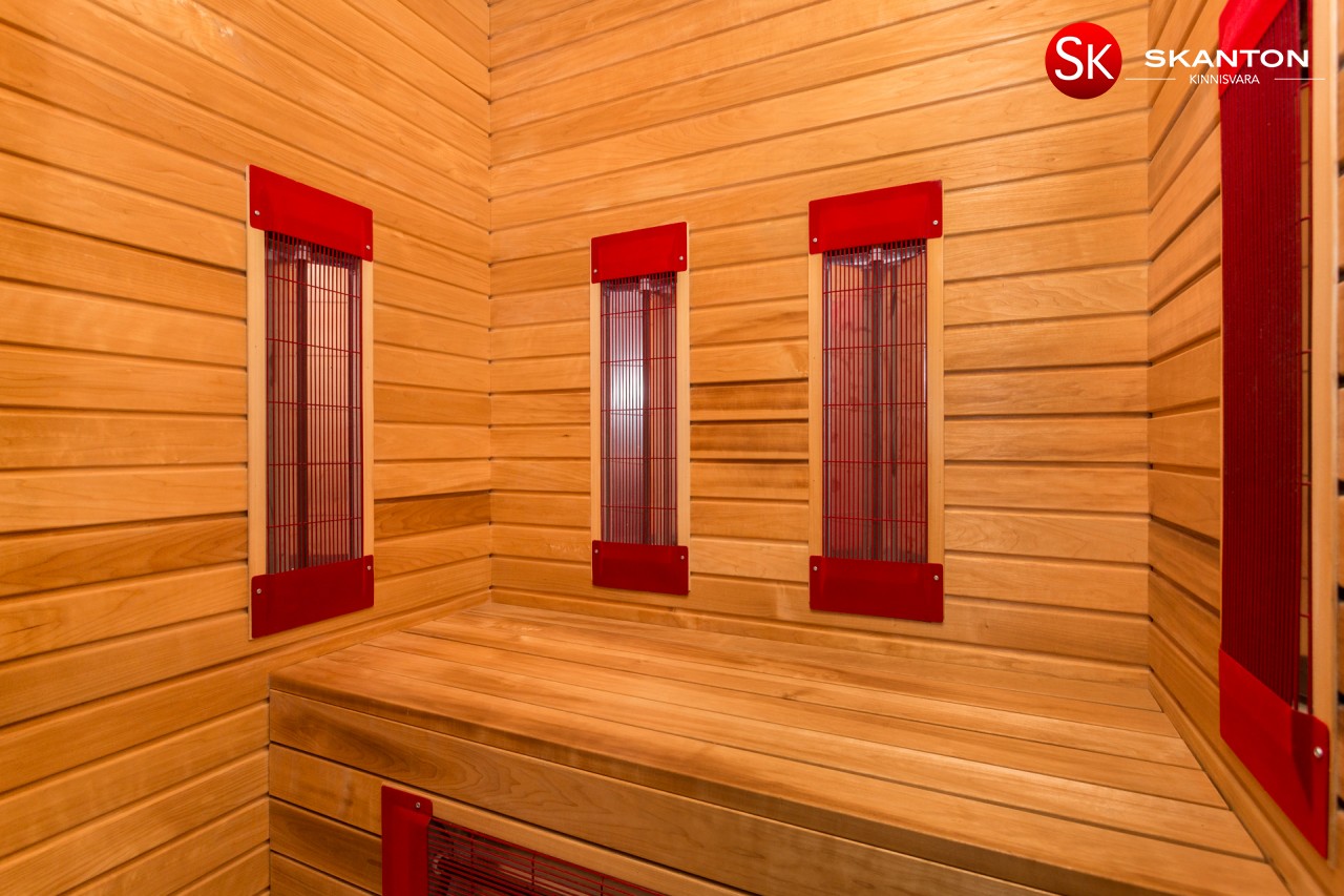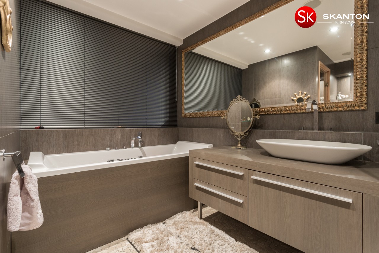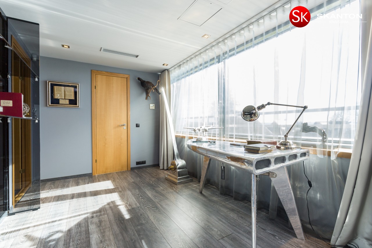 The second floor holds a spacious lobby with wardrobes and a round sea aquarium; a laundry room; two bedrooms; a bathroom-toilet with a bath; a third bedroom with a front room, walk-in wardrobe, infrared sauna with a bathroom-toiler and a glazed balcony. A roomy and a bit secluded study with a bathroom-toilet is also located on the second floor.