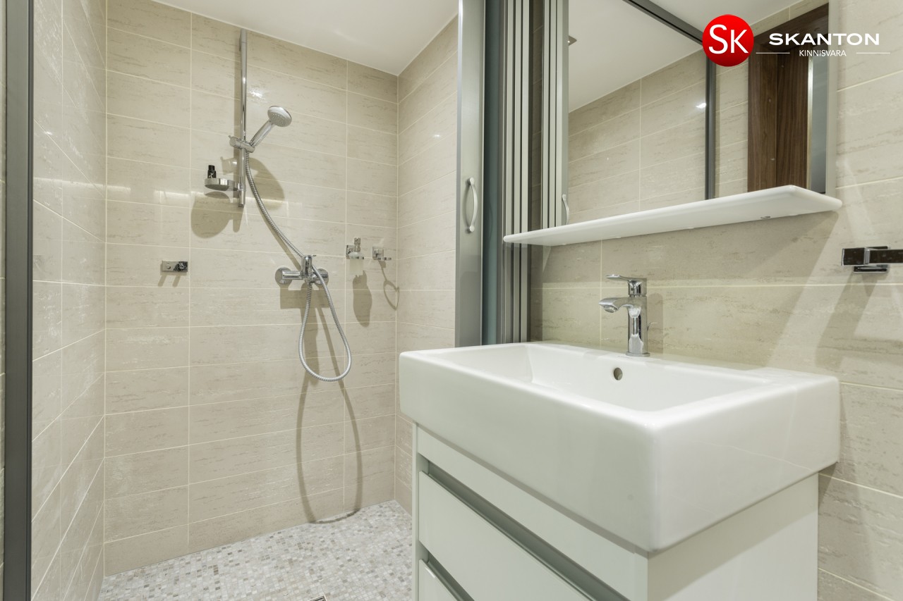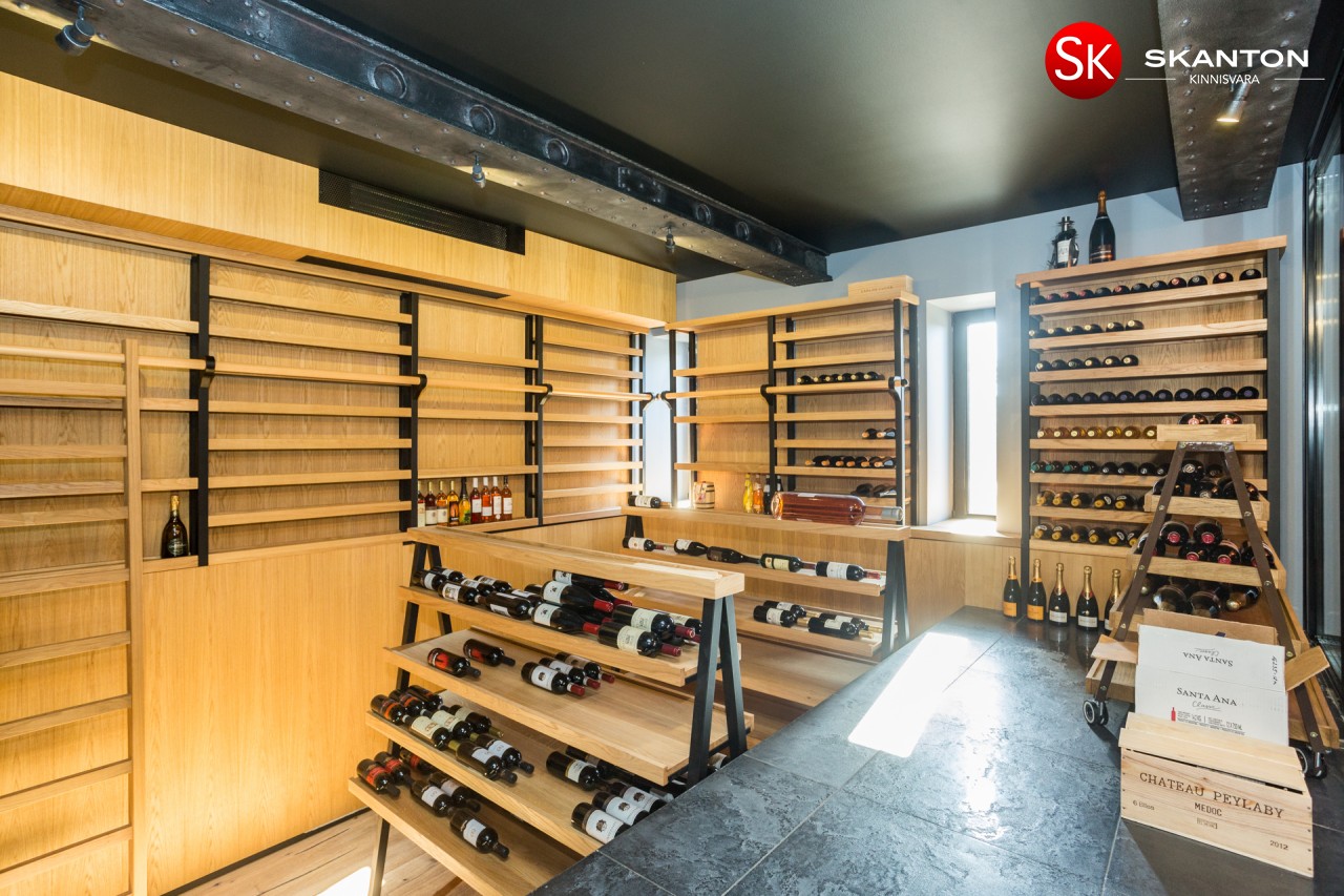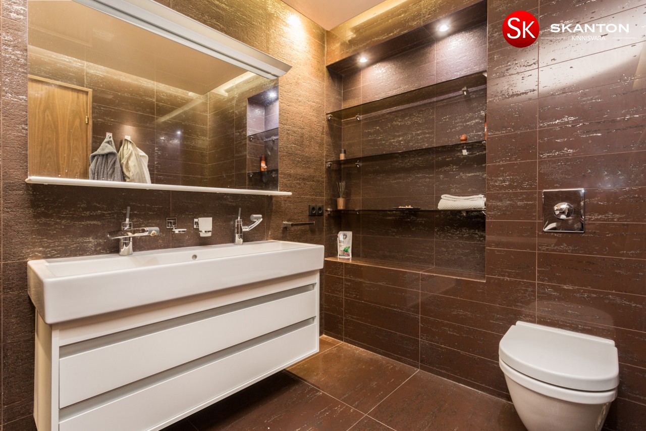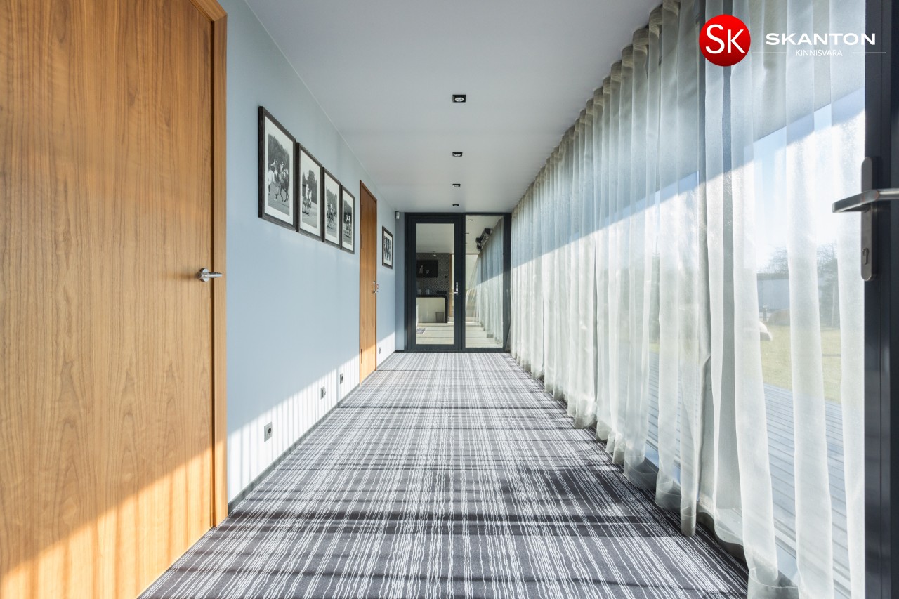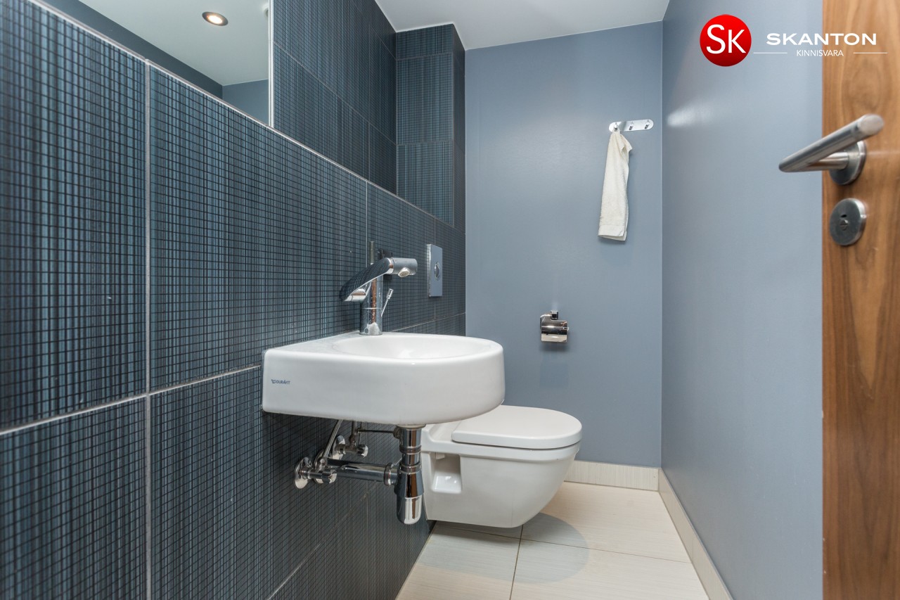 The second floor holds a spacious lobby with wardrobes and a round sea aquarium; a laundry room; two bedrooms; a bathroom-toilet with a bath; a third bedroom with a front room, walk-in wardrobe, infrared sauna with a bathroom-toiler and a glazed balcony. A roomy and a bit secluded study with a bathroom-toilet is also located on the second floor.