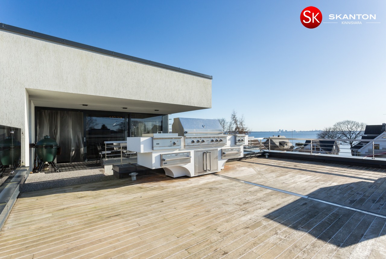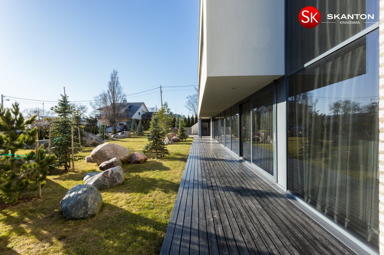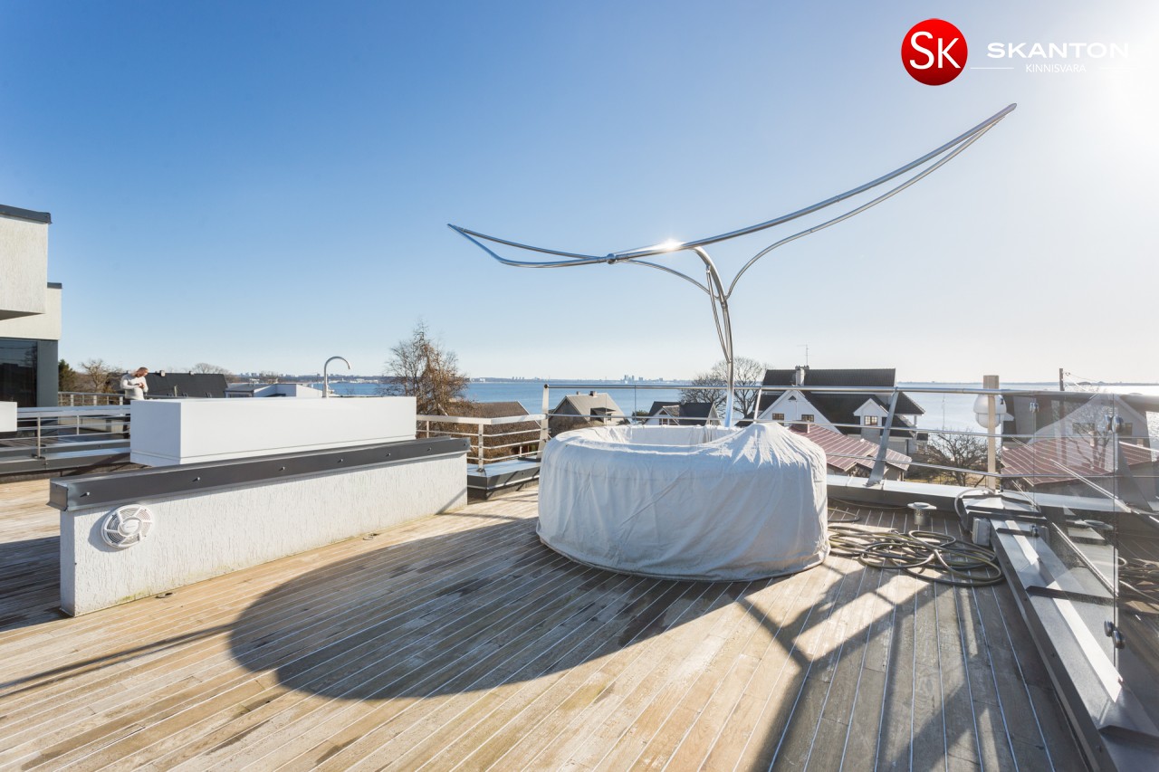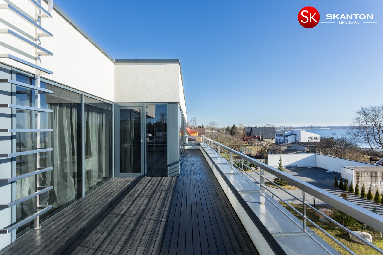The building itself is grand, it has three storeys and it is partially rooted in the ground. The large glass windows and terraces open up glorious views of the sea and Tallinn skyline. The rooms are situated on three levels. The bedroom doors can be code-locked. The doors of the house may be opened using a key or a code; opening with a fingerprint is also possible. In addition to the heated area (799,9 m2), there are more than 200 m2 worth of terraces and balconies.