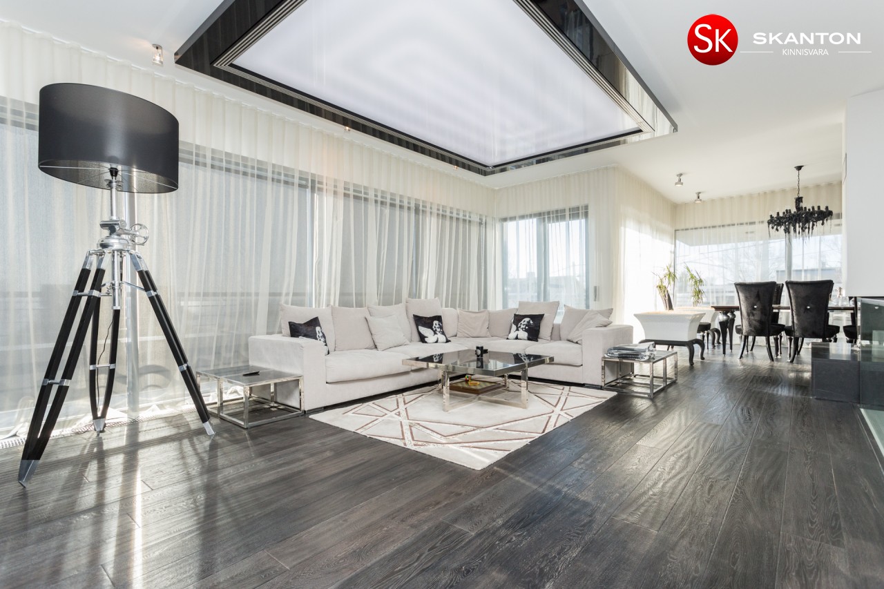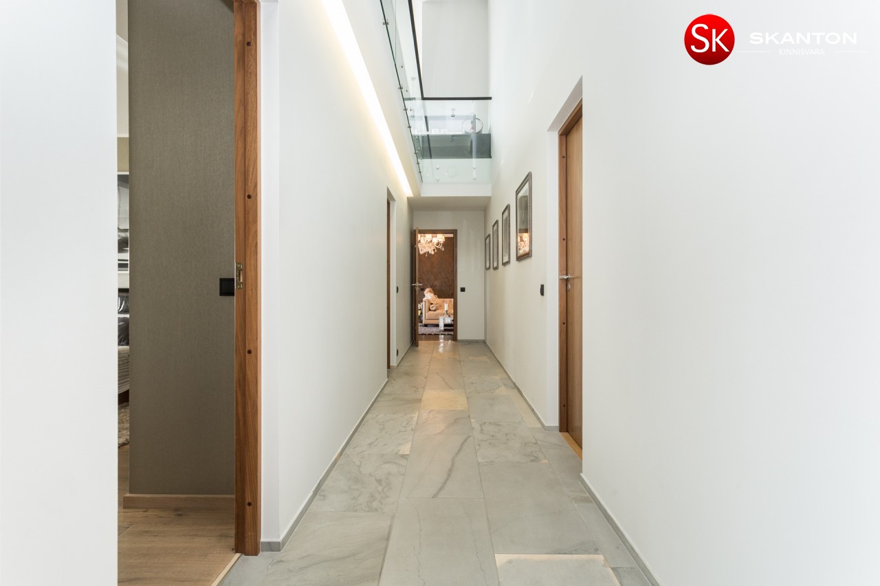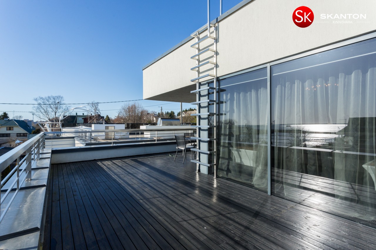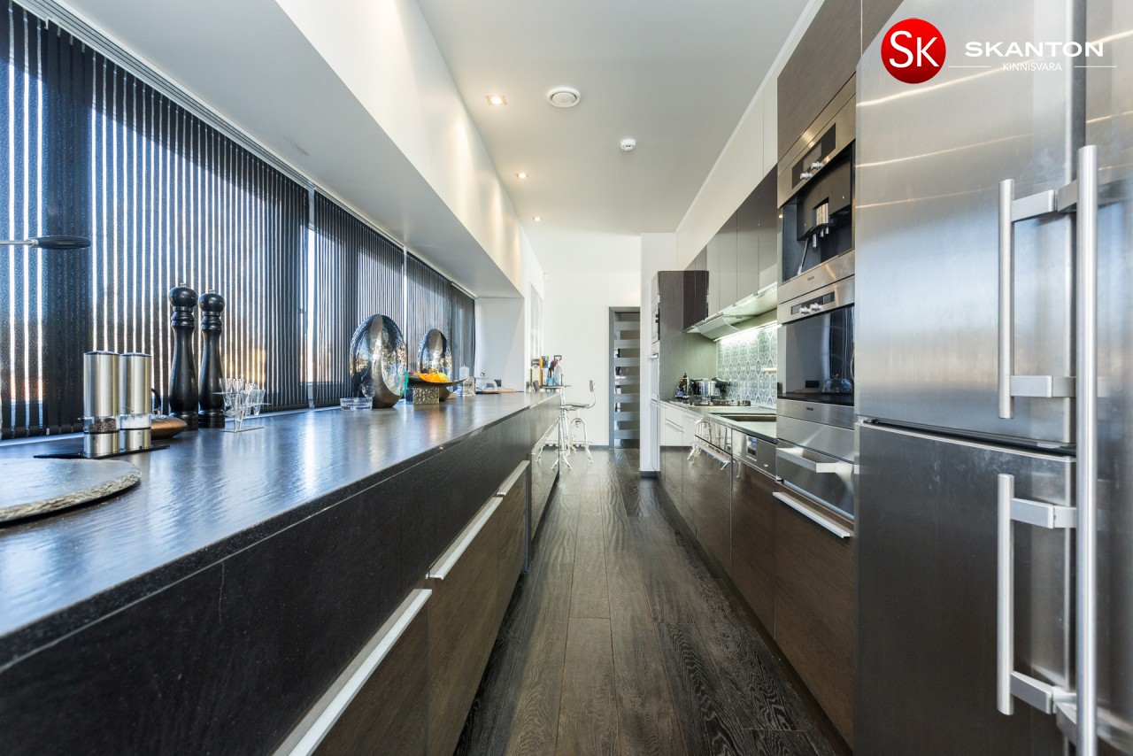The building itself is grand, it has three storeys and it is partially rooted in the ground. The large glass windows and terraces open up glorious views of the sea and Tallinn skyline. The rooms are situated on three levels. The bedroom doors can be code-locked. The doors of the house may be opened using a key or a code; opening with a fingerprint is also possible. In addition to the heated area (799,9 m2), there are more than 200 m2 worth of terraces and balconies.