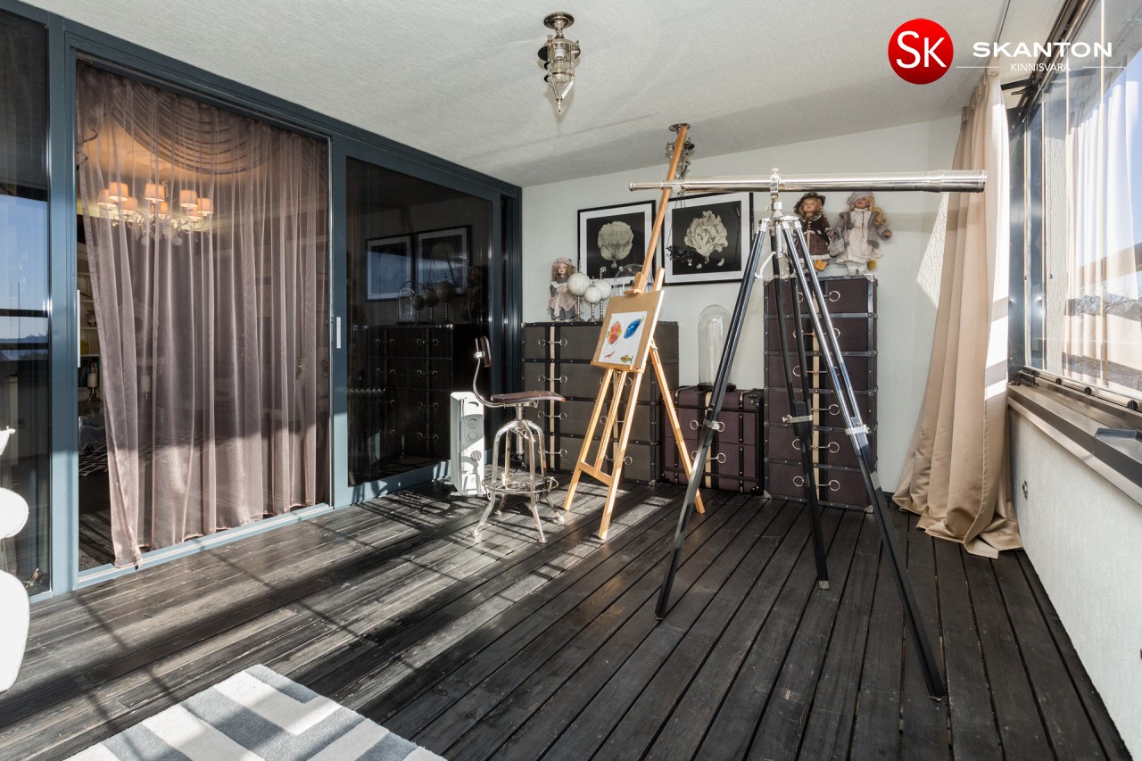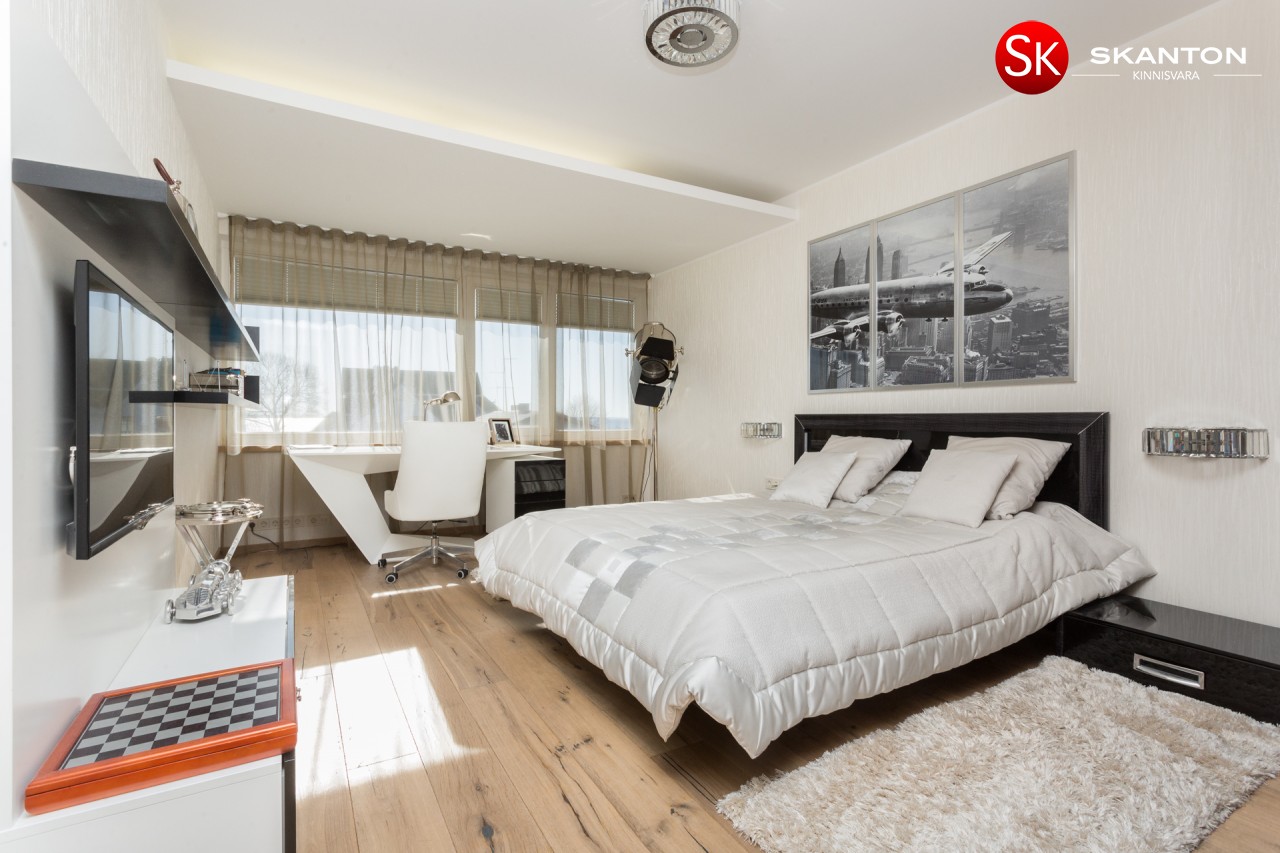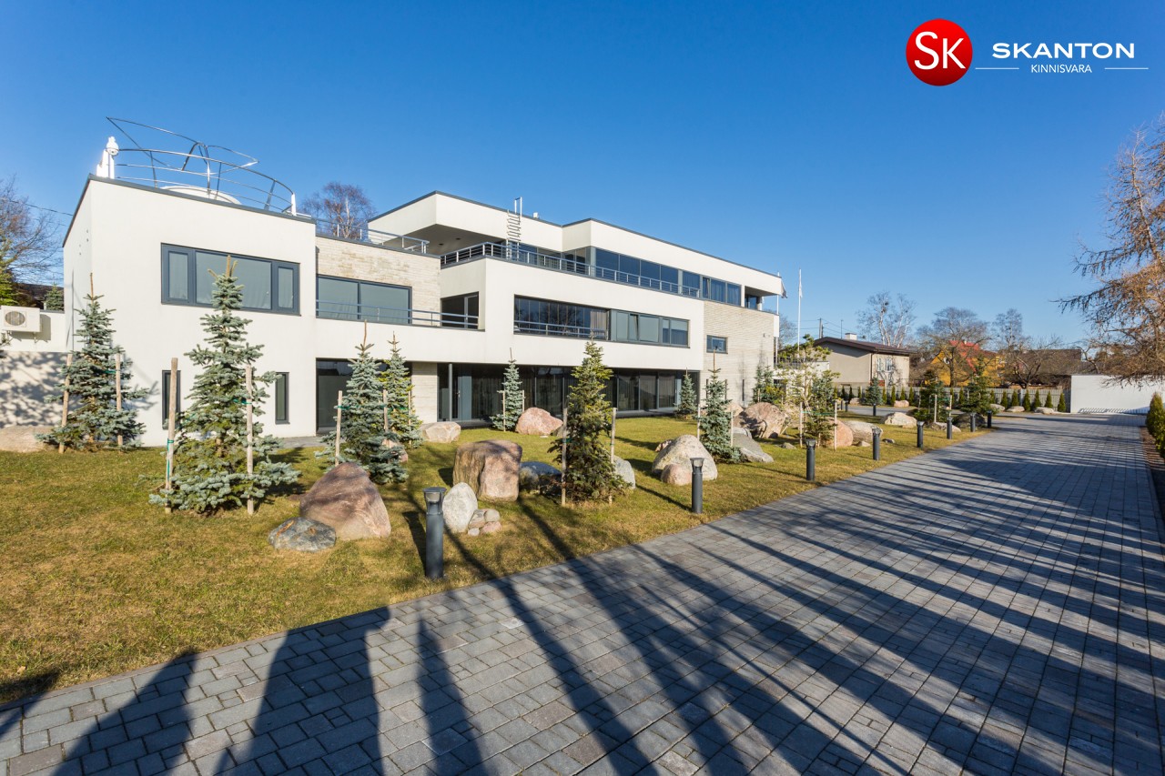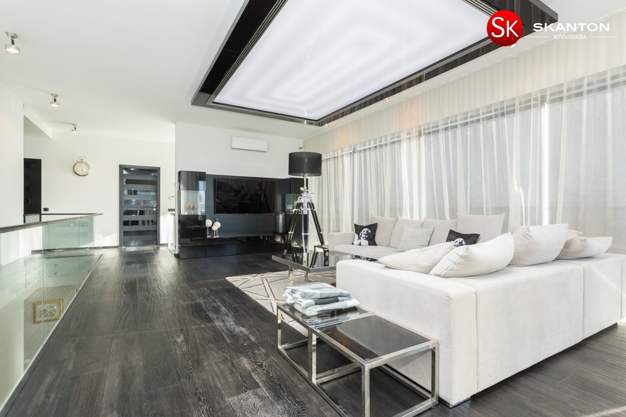 The building itself is grand, it has three storeys and it is partially rooted in the ground. The large glass windows and terraces open up glorious views of the sea and Tallinn skyline. The rooms are situated on three levels. The bedroom doors can be code-locked. The doors of the house may be opened using a key or a code; opening with a fingerprint is also possible. In addition to the heated area (799,9 m2), there are more than 200 m2 worth of terraces and balconies.