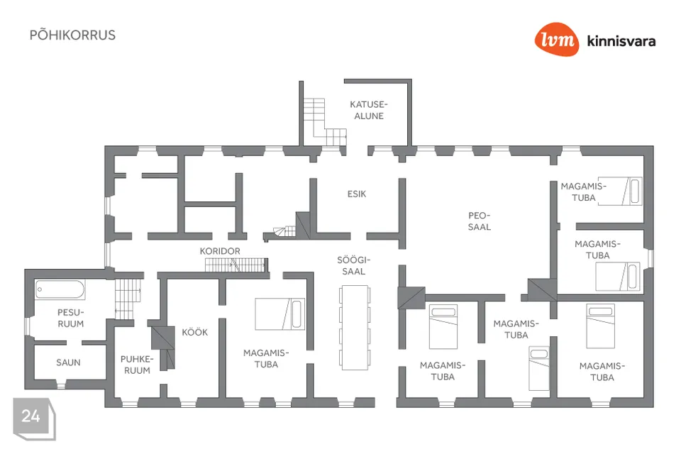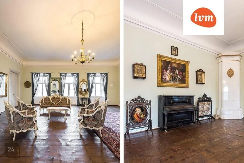 Esimesel korrusel asuvad renoveeritud üksteist erinevat ruumi, millest olulisemad on avar saal, söögituba ja kuus magamistuba. Neli tuba on osaliselt renoveeritud.