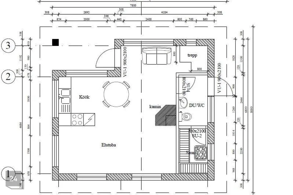 I korrusel: avatud köögiga elutuba,KÖÖGIMÖÖBEL, kamina võimalus. Duširuum, wc ja saunaga.