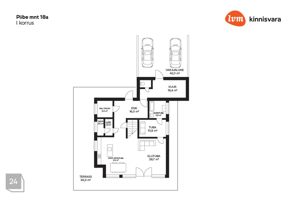 esik; majapidamisruum; leiliruum koos pesuruumiga; suur avatud kõrge laega elutuba-köök, kust pääs avarale 92,3m2 terrassile; põhimagamistuba koos privaatse pesuruumiga.