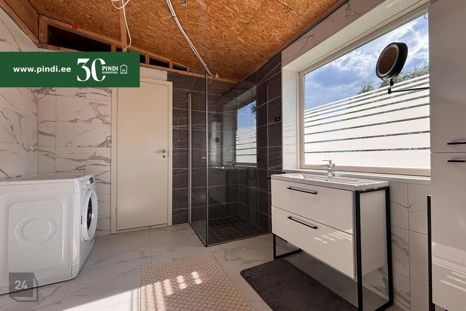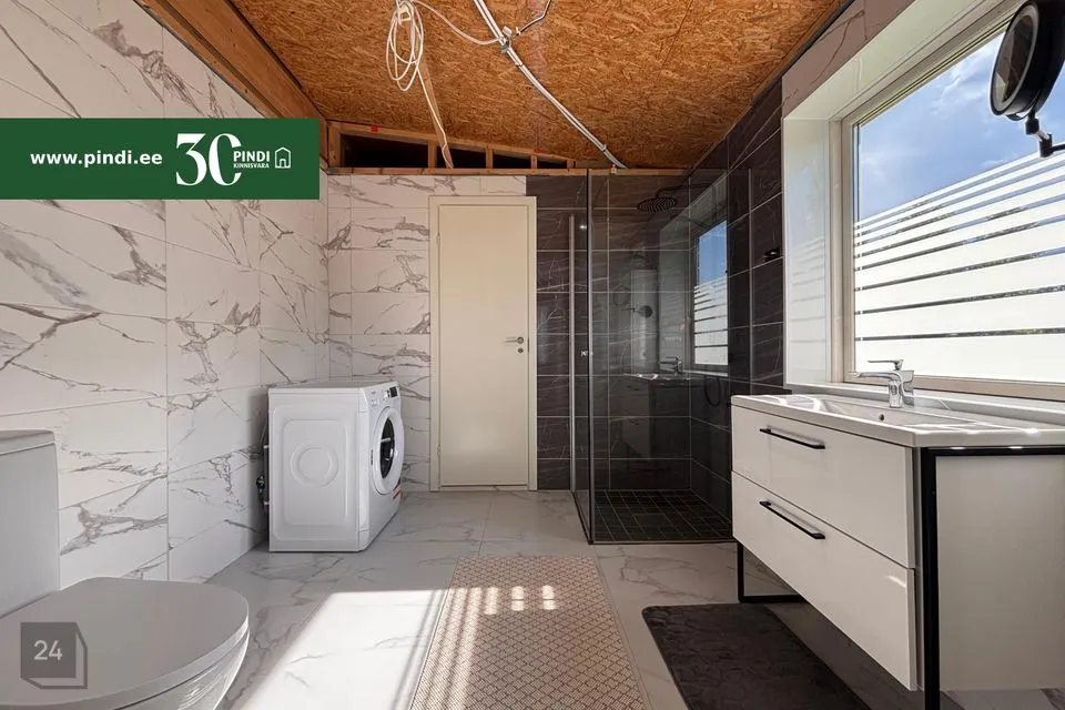 Esikust otse pääseb wc/pesuruumi. Ruumis on dušinurk, valamu ja valamukapp, pesumasin ja kapp. Samuti on pesuruumis aken, mis teeb ruumi avaraks ja valgusküllaseks. Põrandat katab põrandaplaat ja seinu seinaplaat. Lagi vajab ehituse lõpetamist. Ruumist pääseb ka pooleliolevasse ruumi, millest on võimalik tulevikus teha saun.