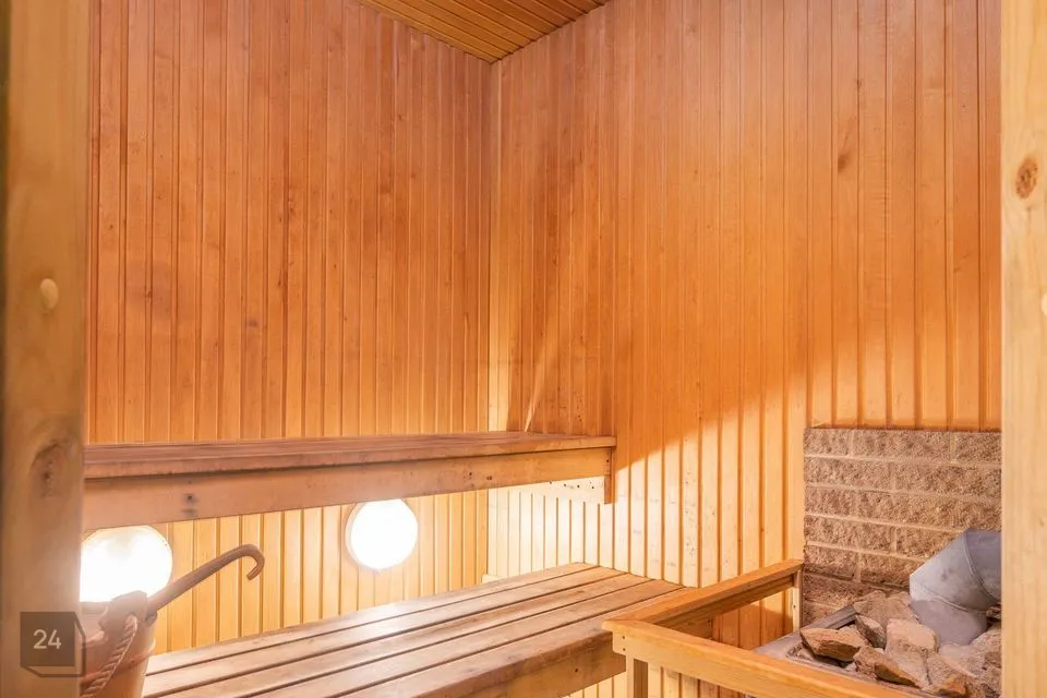 Eluruumid paiknevad kahel korrusel. Esimesel korrusel on esik, abiruum (kasutusel kabinetina), avatud köögiga elutuba, sanitaarruum vanni, dušši ja WC-ga , kaminaga sauna eesruum ning leiliruum.