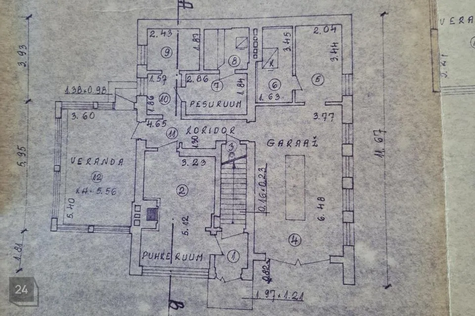 I korrusel esik, sauna eesruum, pesuruum, leiliruum, garaaž, katlaruum, abiruumid, WC, veranda. II korrusel 3 tuba, köök-tuba, vahekoridor, veranda, WC-pesuruum, ühest toast pääs rõdule, Katusekorrusel 2 magamisruumi. Kokku suletud netopind 196,5 m2, eluruumide pind 167,8 m2.