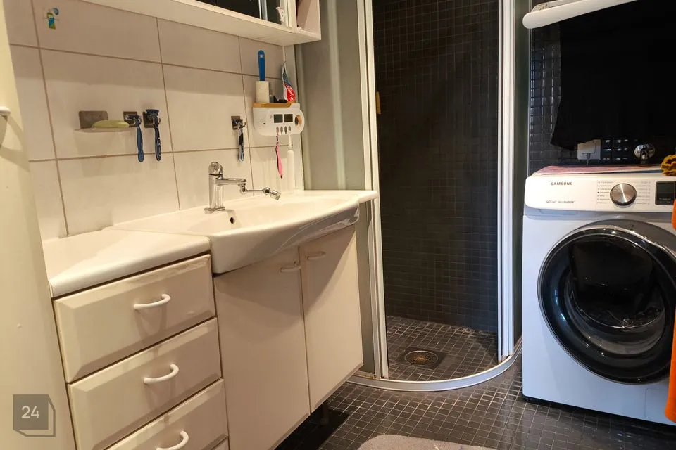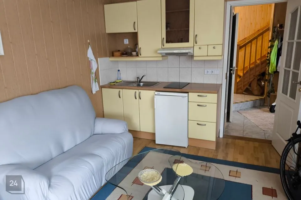 1.korrusel pääseb garaaži ja teise hoonesse,kuhu soovi korral saab siseneda ka hooviuksest.Väiksemal hoonel on oma duširuum koos wc-ga ja toas on ka oma köögiosa,mis võimaldab nooremal/vanemal generatsioonil täiesti autonoomse elamise.