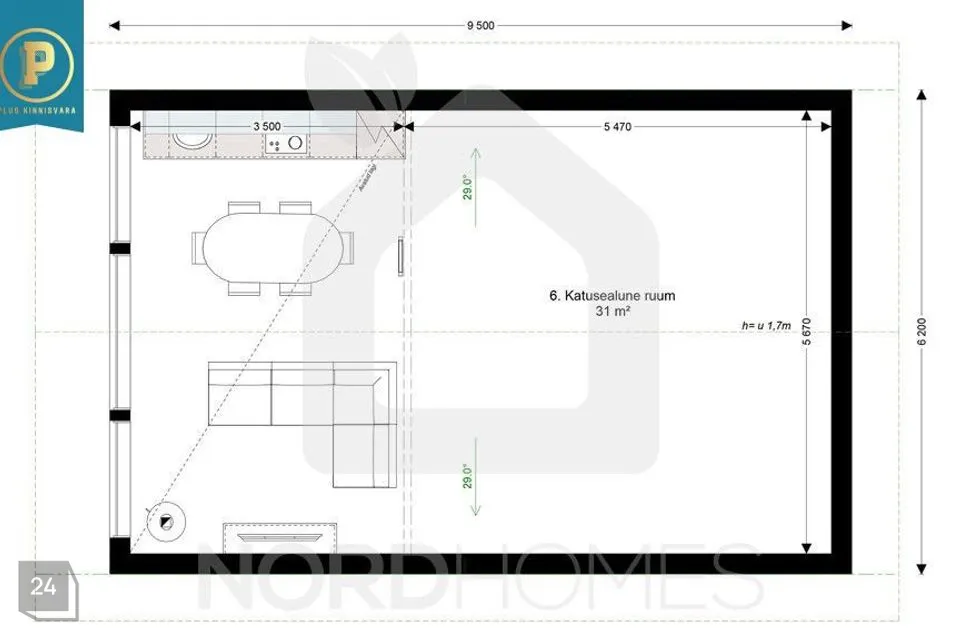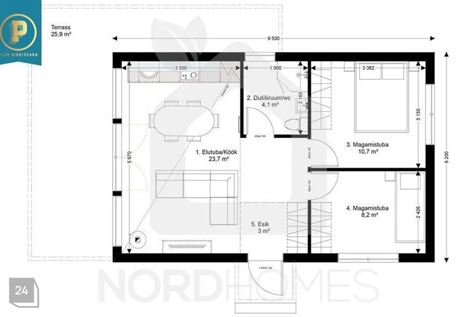 Elementmaja on netopinnaga 50 m2, millele lisandub ca 20 m2 poolkorrus magamistubade