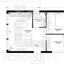 Elementmaja on netopinnaga 50 m2, millele lisandub ca 20 m2 poolkorrus magamistubade