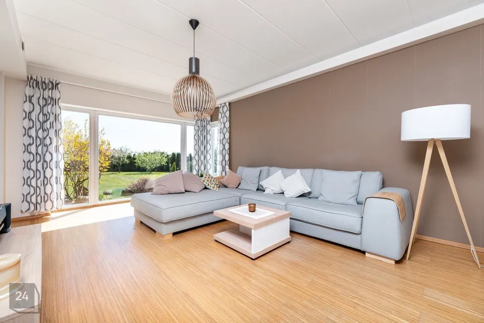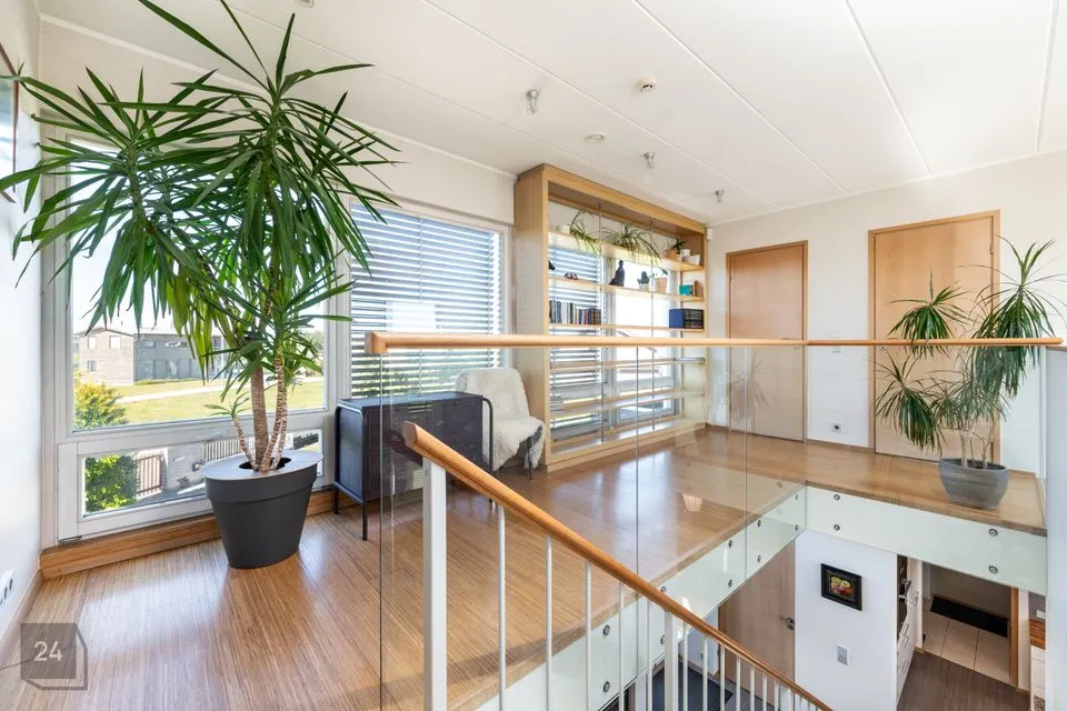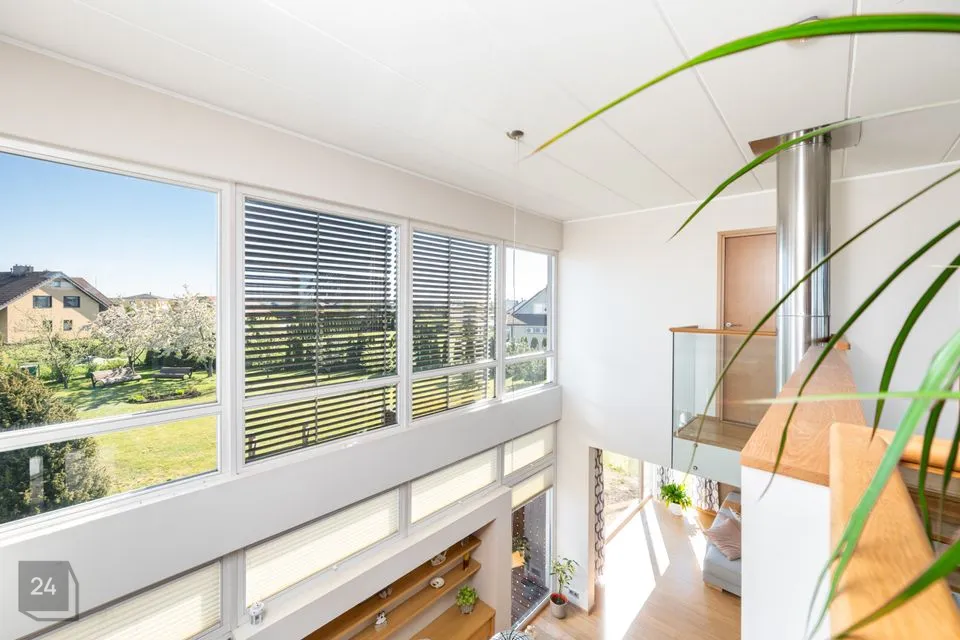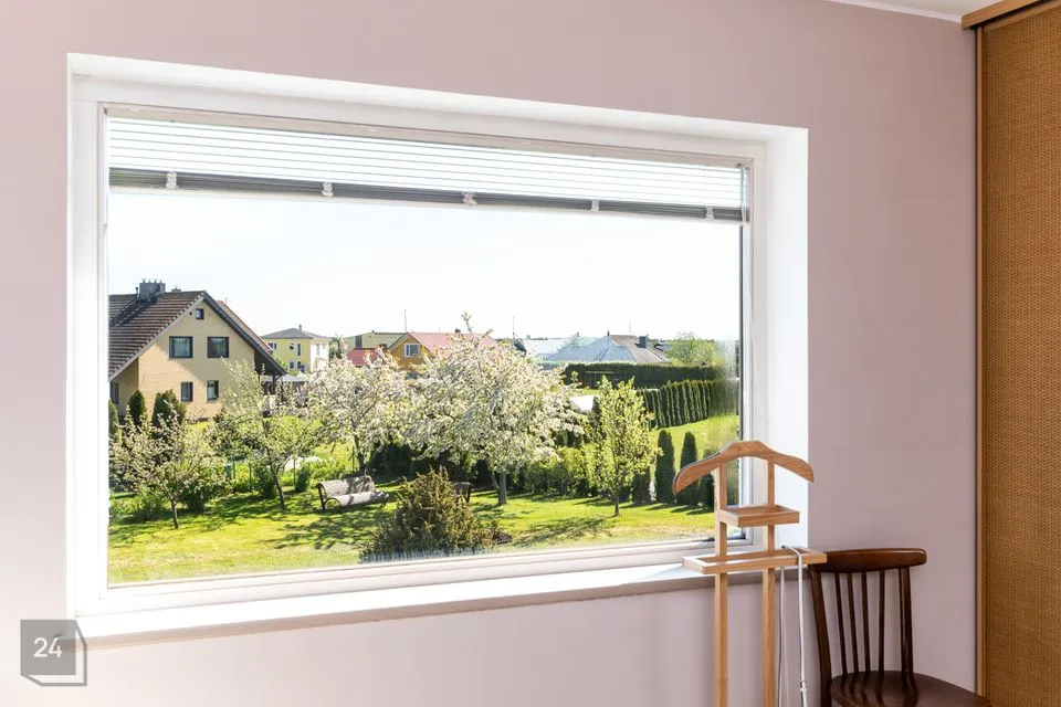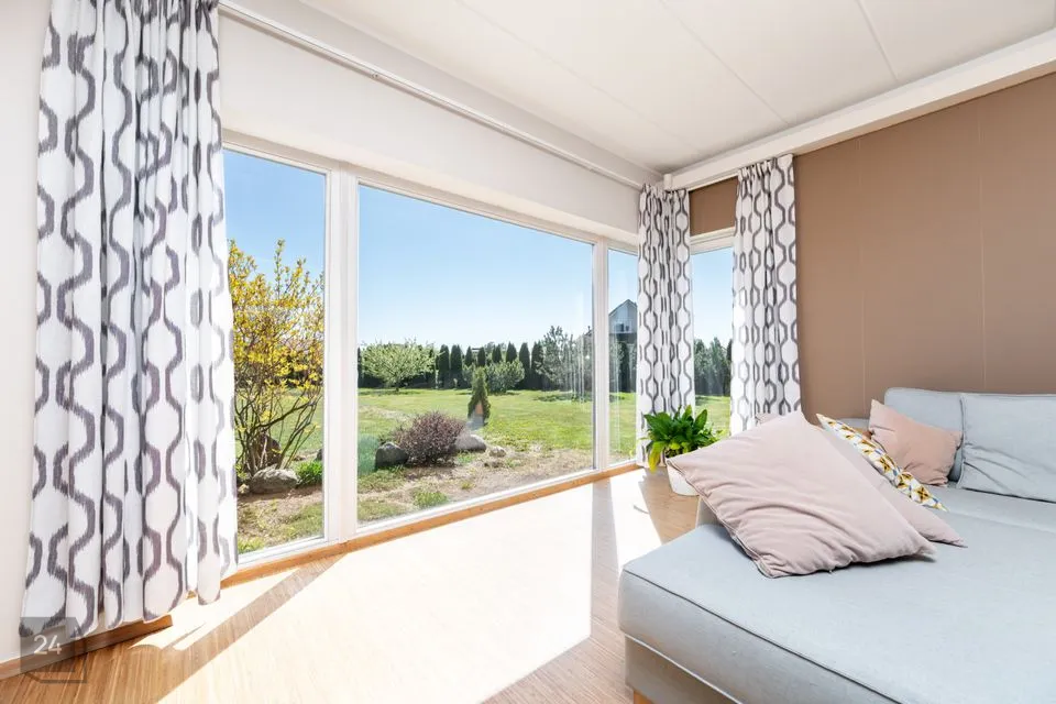 Põrandal naturaalne parkett ja puitraamidel aknad.