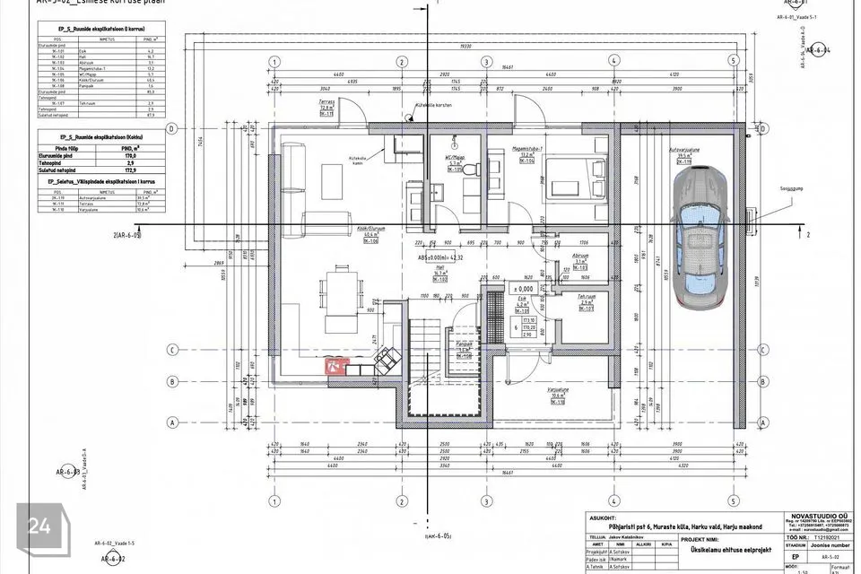 Esimesel korrusel: avatud köögiga elutuba, kabinet, garderoob, panipaik, garaaž , külaliste WC + dušš, pesuruumiga.