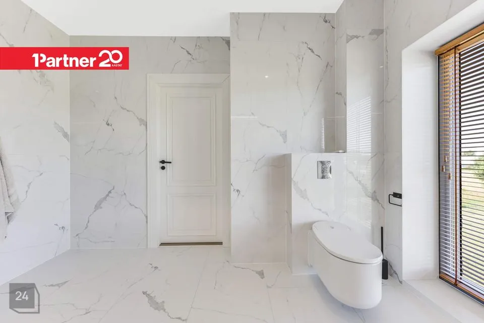 Eluruumide põrandatel heledates toonides marmor imitatsiooniga plaadid, kontrastina tumedamates toonides saunakompleks.