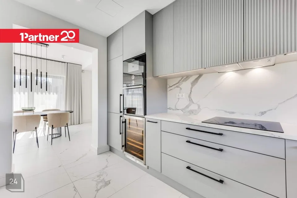 Eritellimusel valmistatud kunst marmorkivist töötasapinnaga köögimööbel ja kvaliteetne Bosch köögitehnika (integreeritud külmkapp, nõudepesumasin, elektripliit, küpsetusahi, mikrolaineahi, veinikülmik).