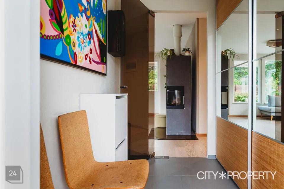 Päikesekatus + 15kW akud elektri salvestamiseks ja tagasimüümiseks. Elektrijuhtmed on viidud ka kahekohalise autovarju alla, et soovi korral rajada elektriauto laadimine. Nordpeis soojust salvestav kamin-ahi. Valguskaabliga internet ja palju muud.