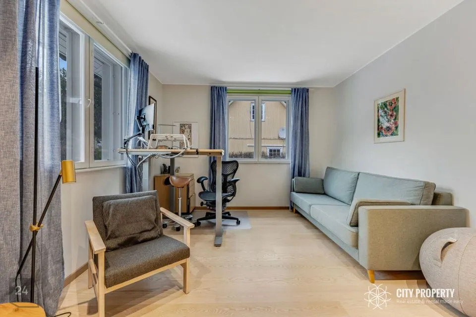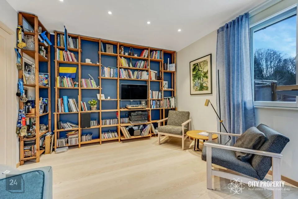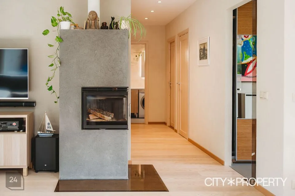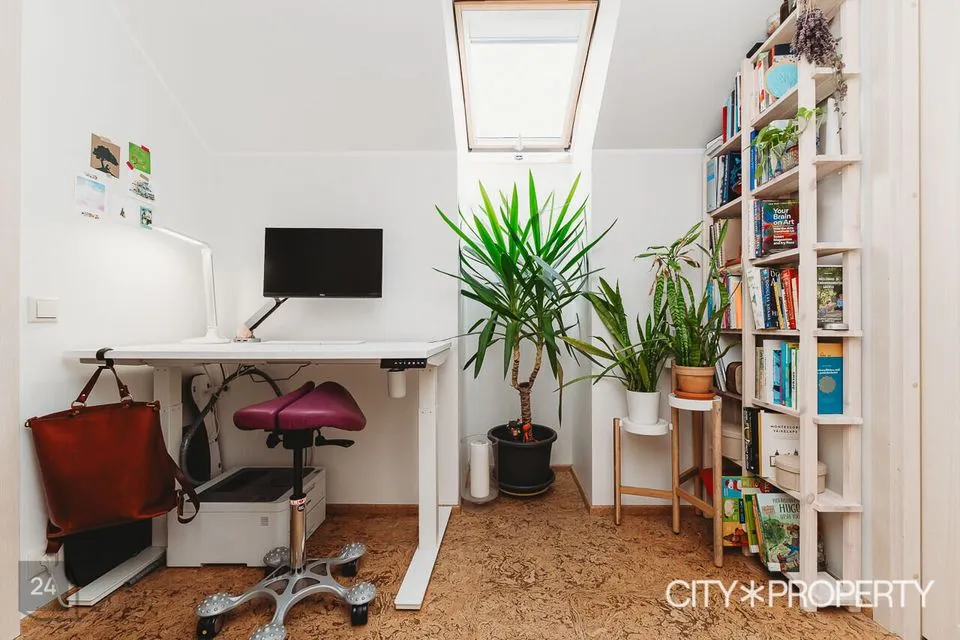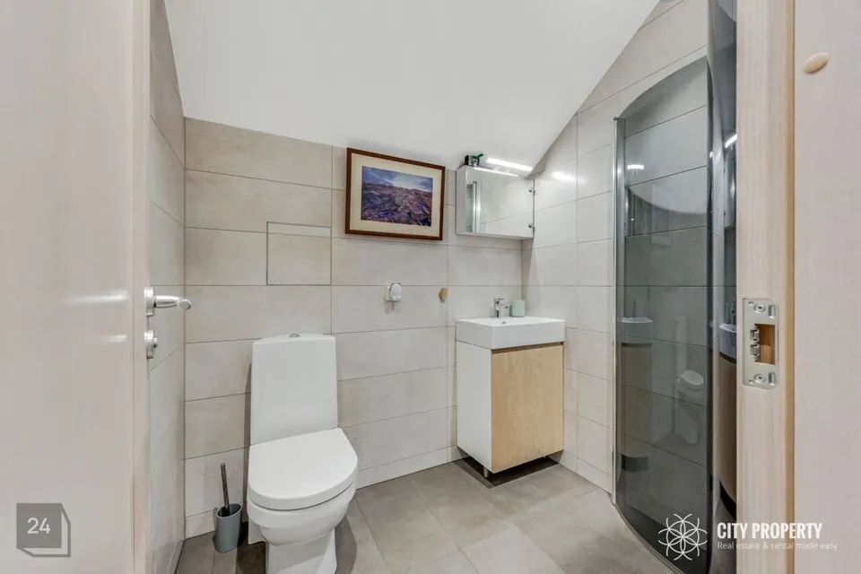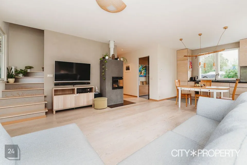 1,5 korrust, 3 magamistuba, 2 tualetti/duširuumi ja eraldi suur duširuum. Avatud köögiga elutuba, panipaik, katla-tehnoruum, koridor, lisaks väike kontorinurk. 2 terrassi - hommiku- ja õhtupäikesega. Integreeritud köögimööbel.Netopind 104m2, brutopind 143m2.