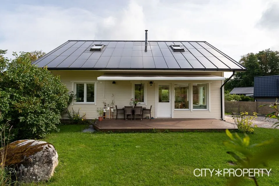 Päikesekatus on paigaldatud Roofit.solar poolt. 15kW integreeritud paneelidega plekkkatus on silmale märkamatu, kuid sama märkamatult tõhus ja tootlik. Koos väiketootja toetusega oli 2024 - 2025. aasta august kogu maja elektriarve 327 eurot. Aastas. Kokku. NB! See on ca 27 eurot kuus!!! 3x5kW akud salvestavad vajaliku energia endasse, mida siis tagasi tarbida. Olemas on ka võimalus, mis elektrikatkestuse korral lülitab kogu süsteemi akude peale. See maja ongi 99% off-grid! (https://roofit.solar/et/)
