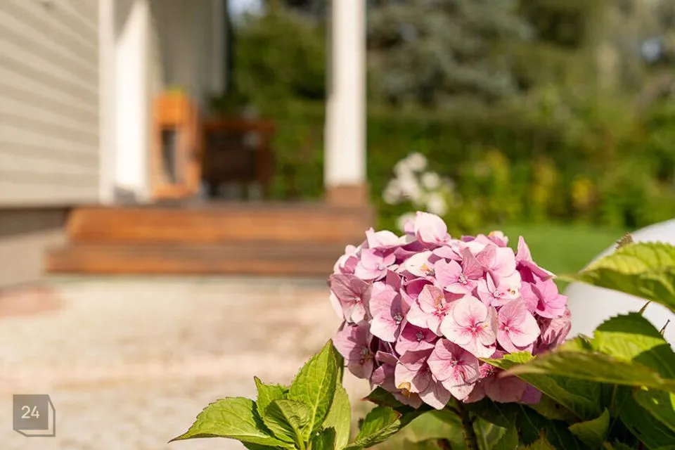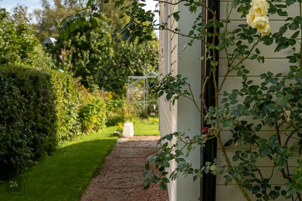 Maja ümbritseb kahelt poolt privaatne aed kõrge planguga. Maja külgedel disainelementidena (kui ka praktilised ja loodussõbralikud) suured paekiviplaadid. Iluaed ja lilled tärkavad kogu kevade ja suve jooksul.