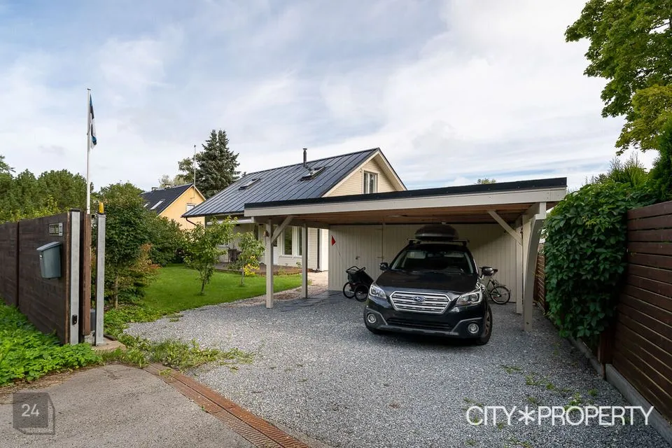 Kahekohaline autovarjualune-kuur on väga mahukas (42m2). Tellitud Palmakost (vaata ka mudelit Karl - https://www.palmako.ee/et/karl-406-m2) ning värvitud majaga sama tooni. Mahutab kõik jalgrattad, muruniiduki ja trimmeri, prügisorteerimiskastid. Kuid see võib olla ka väike tööruum või mancave - võimalusi on mitmeid. Autovärav on otseloomulikult elektriga - avatav nii puldi kui telefoniga helistades. Hoovi ühes ääres on ka tulemüür, mistõttu saab sinna paigutada kas sauna või ehitada see nurk hoopis väliköögiks, grilli-kamina ja puhkealaga.