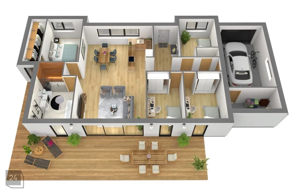 Maja keskel asub avar elutuba koos köögiga. Maja ühes küljes asub suur magamistuba koos garderoobiga, millest pääseb otse terrassile. Samas majapooles asub ka suur vannituba koos saunaga. Maja teise tiiba jäävad kolm magamistuba, tualettruum, mahukas esik, garaaž ning tehnoruum/panipaik. Tehnoruum on piisava suurusega, et sinna paigutada pesumasin ning kuivati, mis loob mugavust pesu pesemisel ning koristustarvikute hoiustamisel.