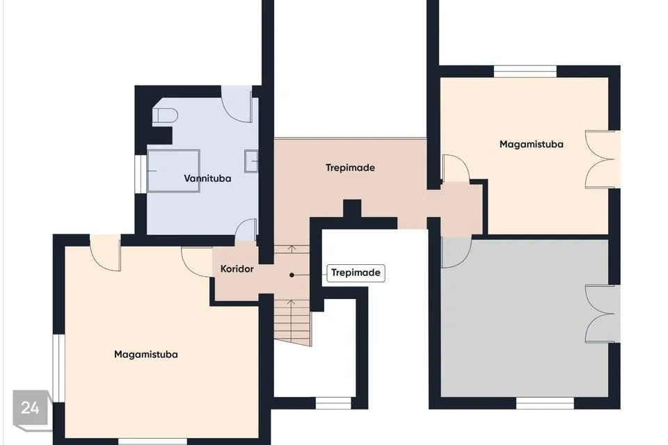 Teisel korrusel on kolm eraldi magamistuba, avar trepihall (hetkel raamaturiiulitega, aga saab kasutada ka muul otstarbel) ning vannituba Aquatori mullivanniga ja sundventilatsiooniga.