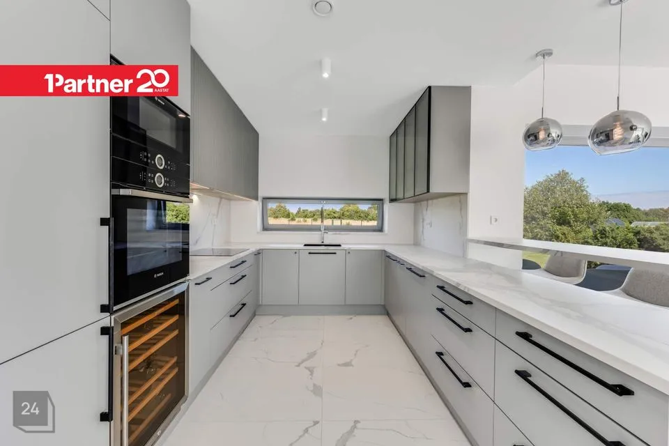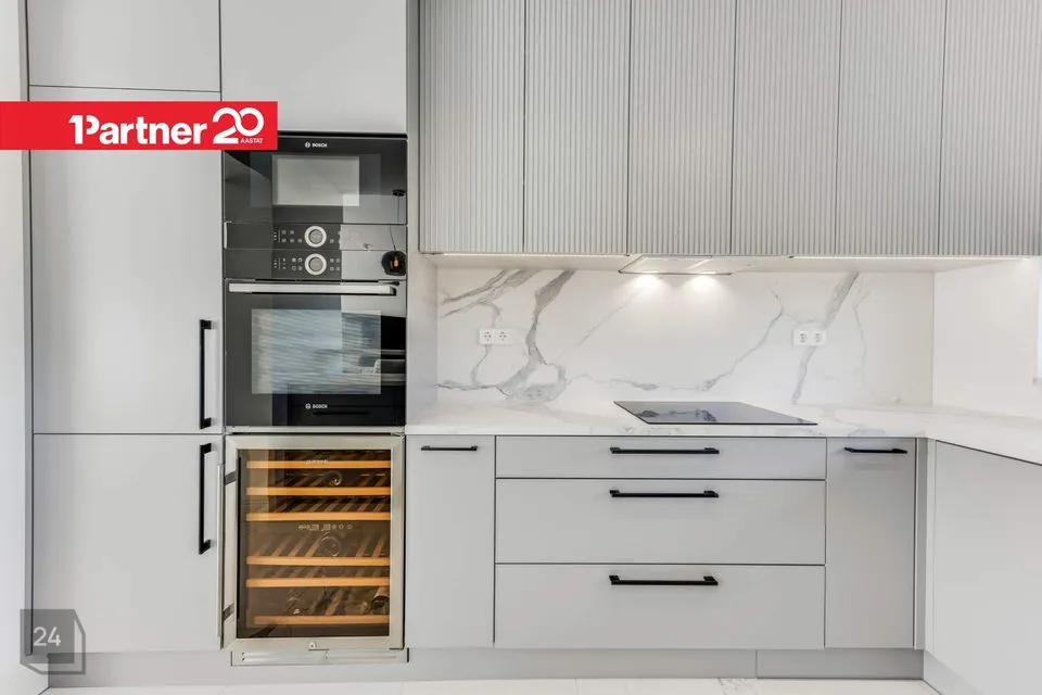 Eritellimusel valmistatud kunst marmorkivist töötasapinnaga köögimööbel ja kvaliteetne Bosch köögitehnika (integreeritud külmkapp, nõudepesumasin, elektripliit, küpsetusahi, mikrolaineahi, veinikülmik).