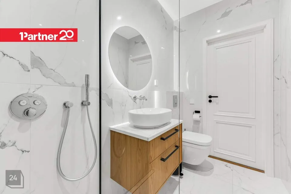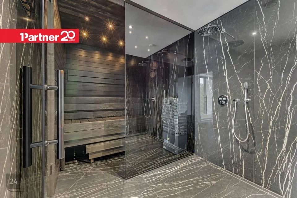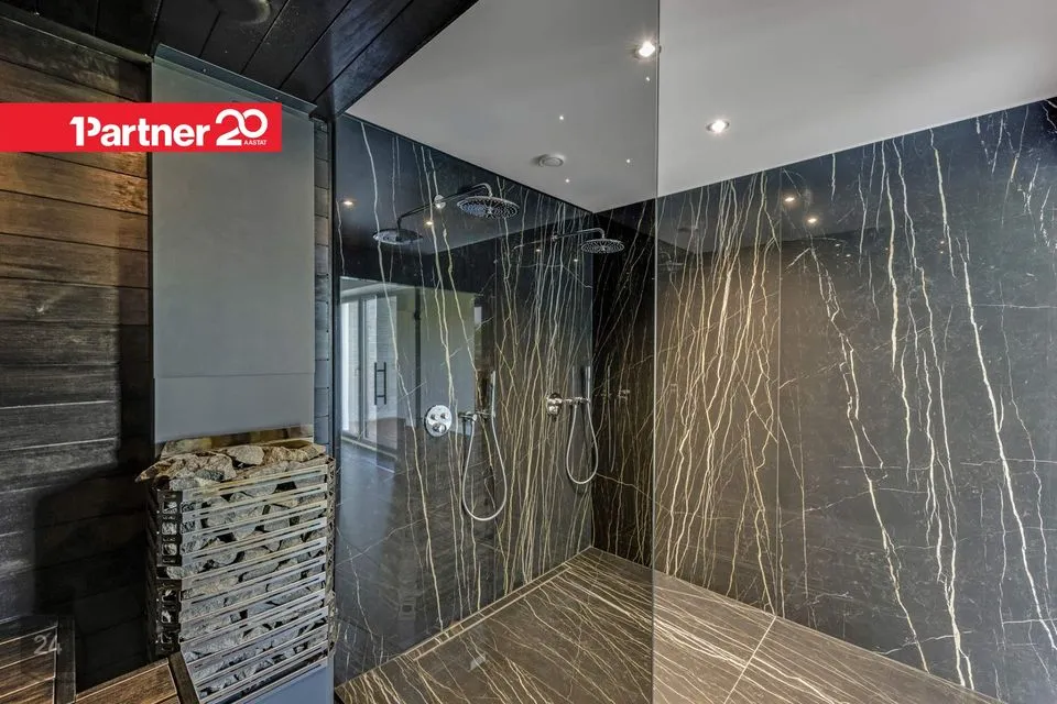 Eluruumide põrandatel heledates toonides marmor imitatsiooniga plaadid, kontrastina tumedamates toonides saunakompleks.