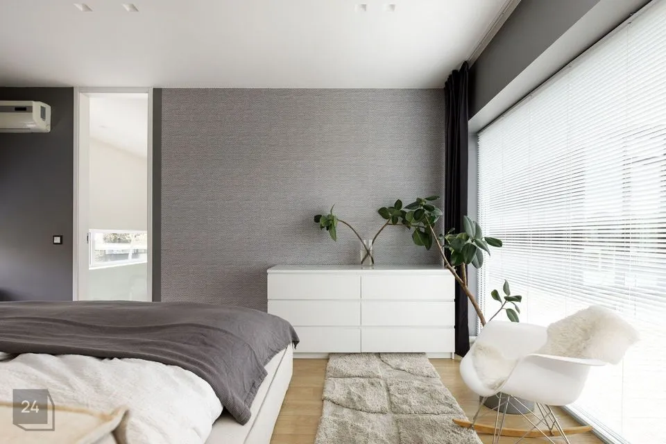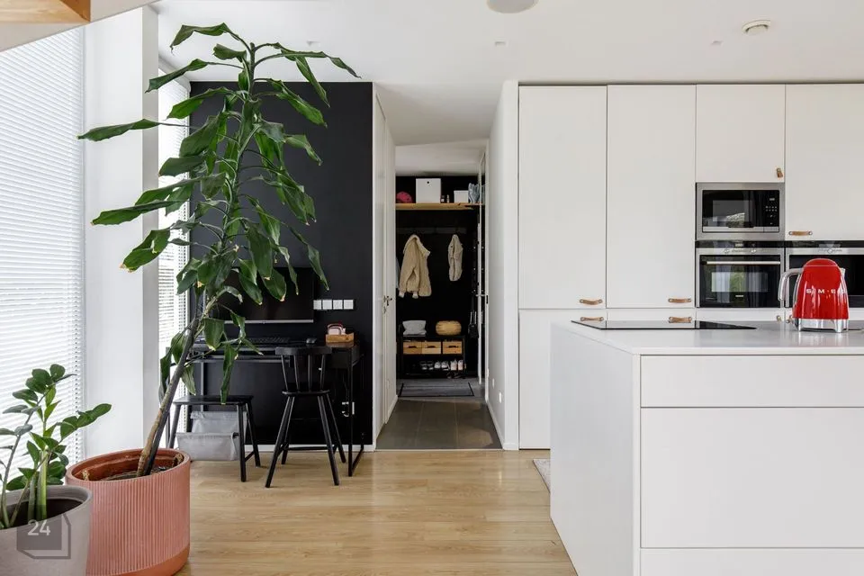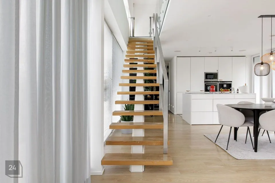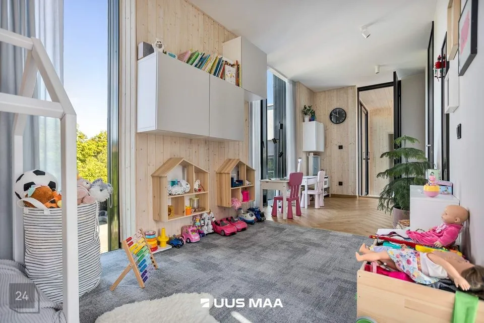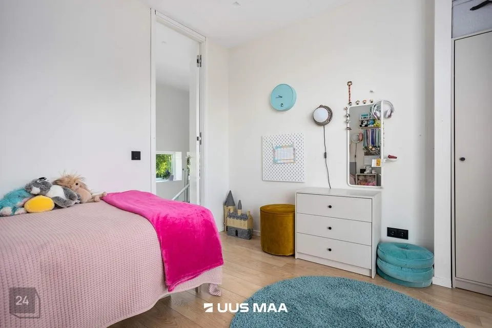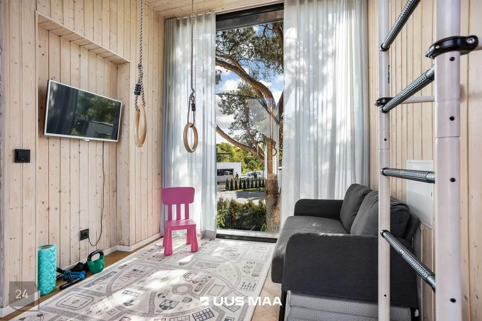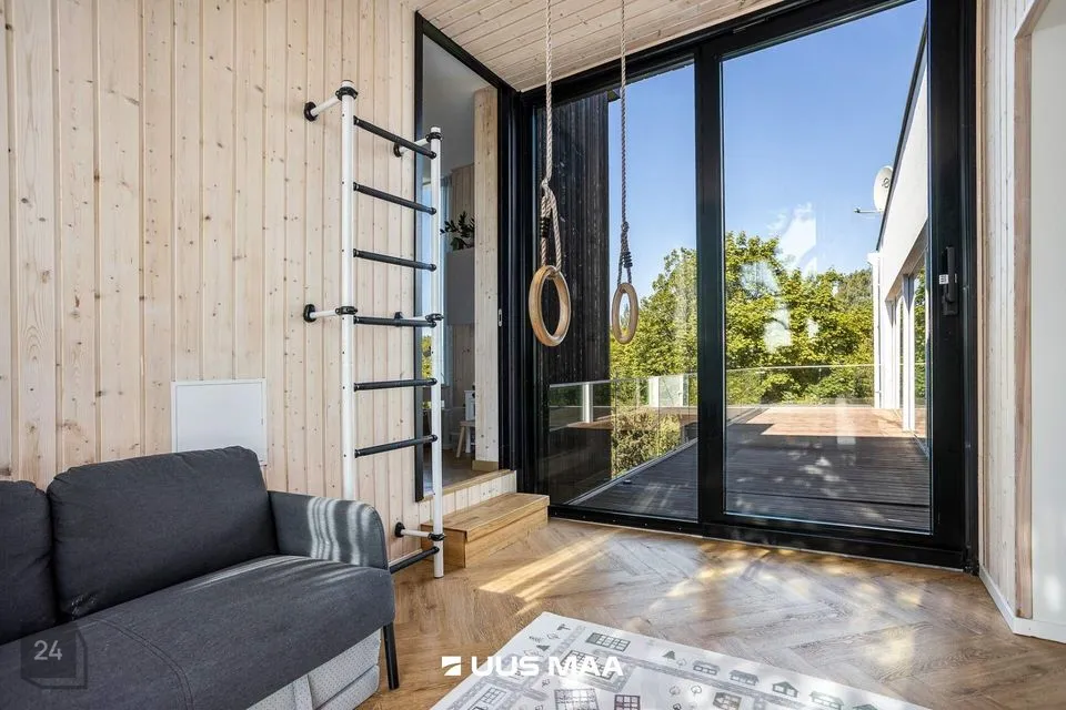 Kodu on valgusküllane, avara planeeringuga ning suurte akendega, mis toovad tuppa rohkelt loomulikku valgust.