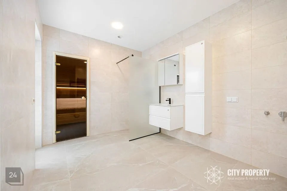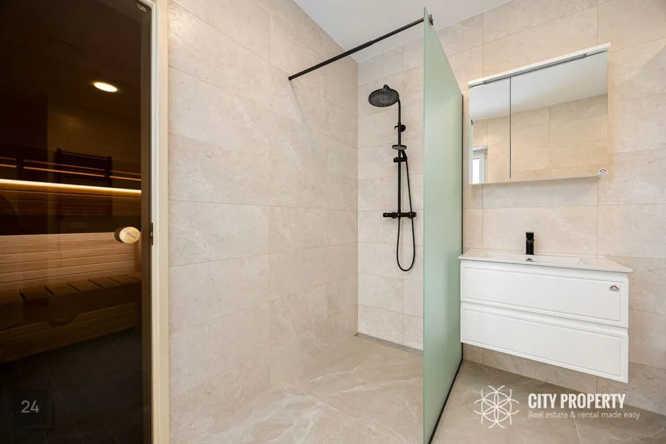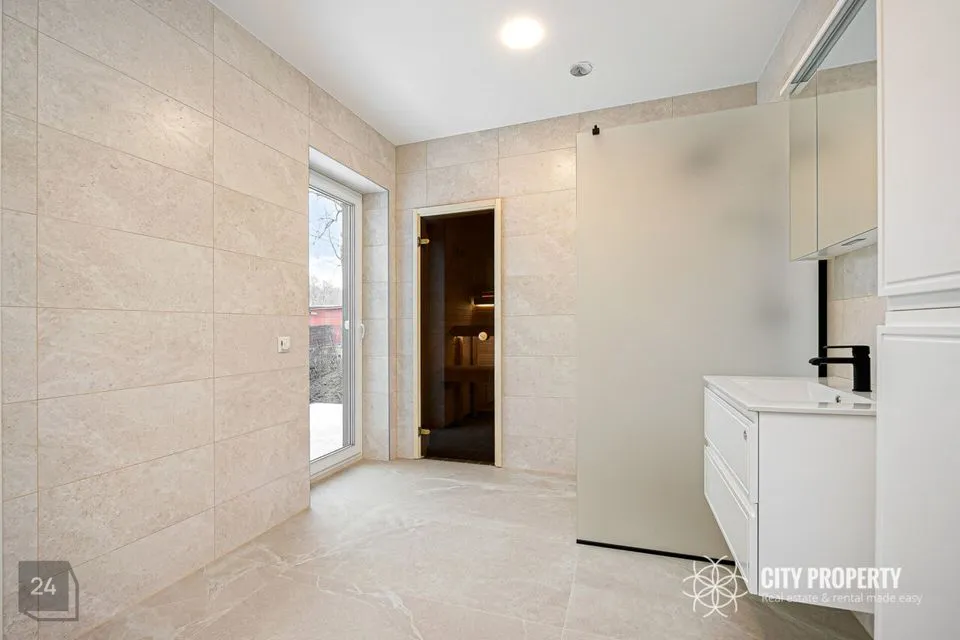 Avar esik, suur elutuba kööginurgaga, 3 magamistuba, väike panipaik, 2 dušširuumi, 2wc, saun, suur tehnoruum.