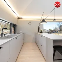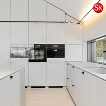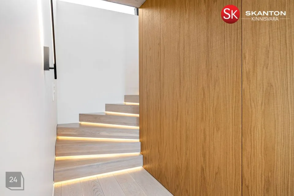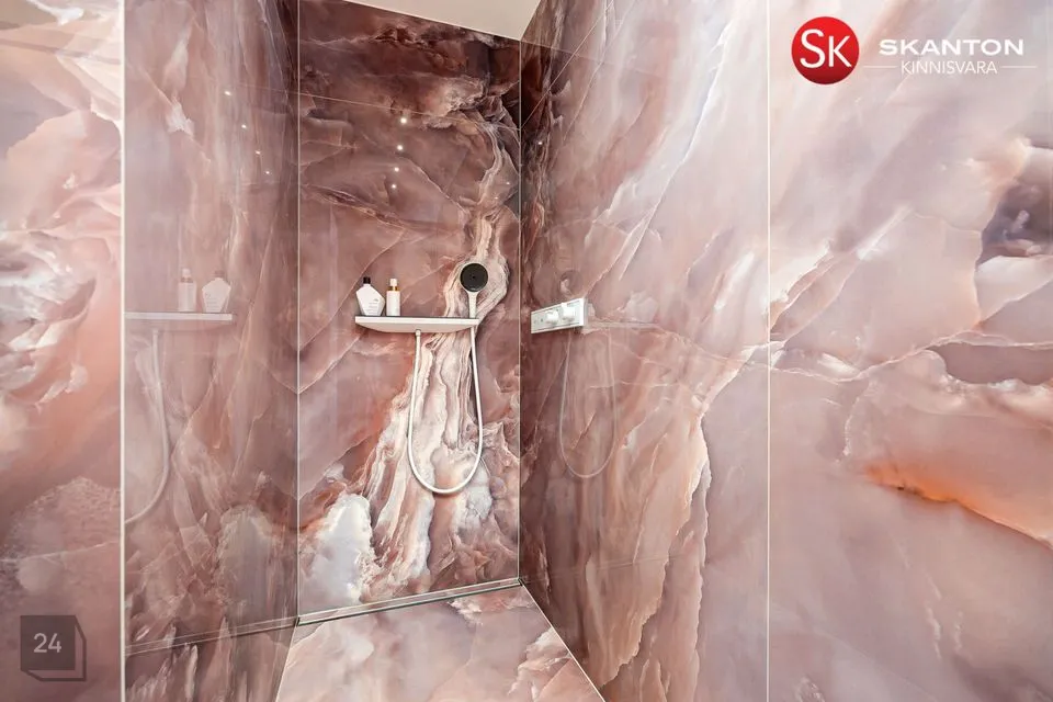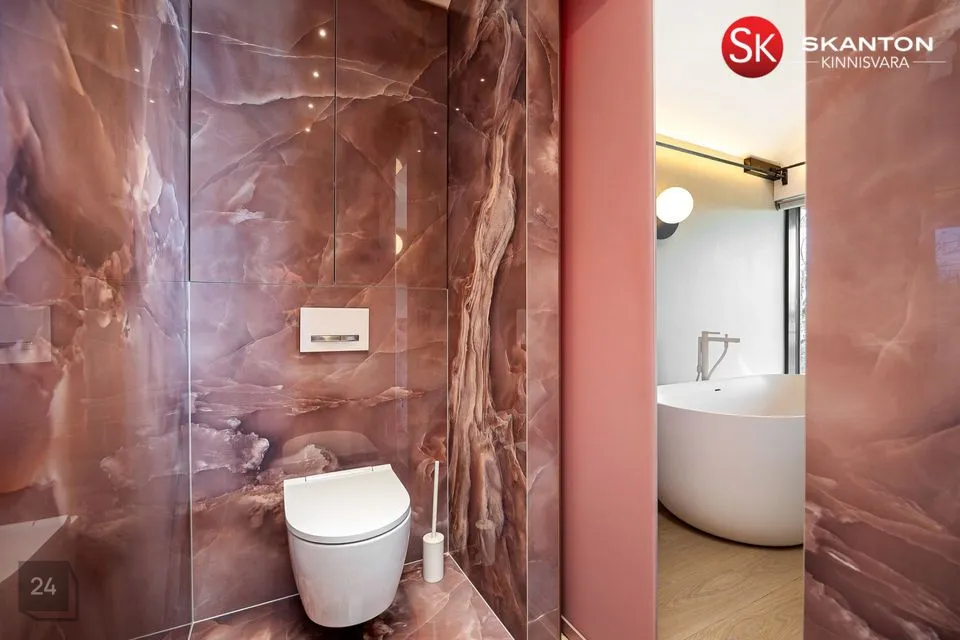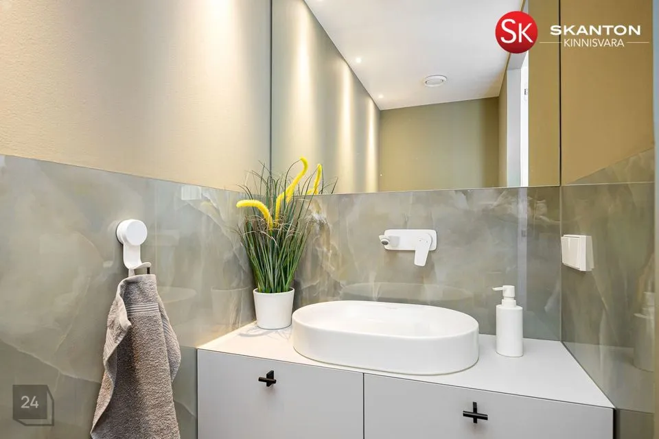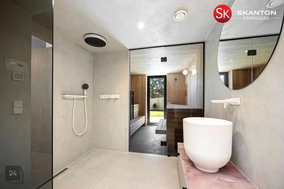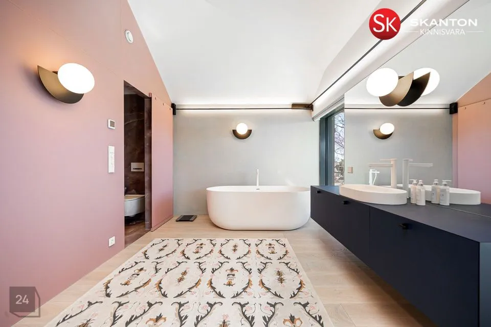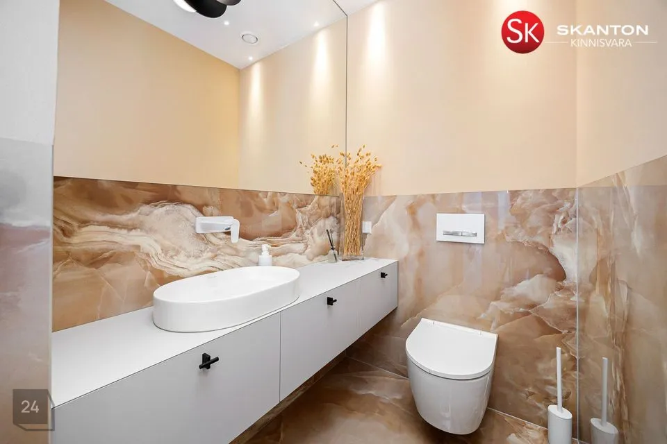 Sanitaartehnika peamiselt Hansgrohe ja Geber, taustvärvitud klaassein, mustrisse plaaditud slab-plaadid on vaid mõningad märksõnad, mis maja siseilmet kujundavad.