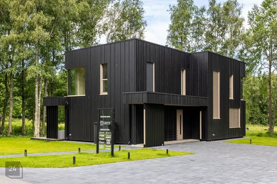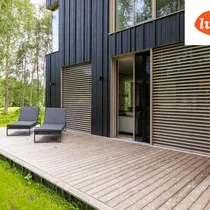 Maja välissein on kaetud termopuiduga, samuti terrassid on tehtud termopuidust.