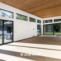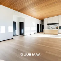 Põrandaid katab naturaalne tammeparkett, mida komplimenteerib puit elutoa laes.