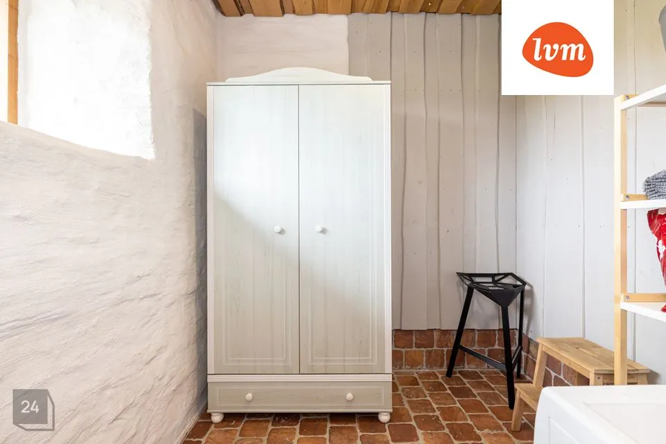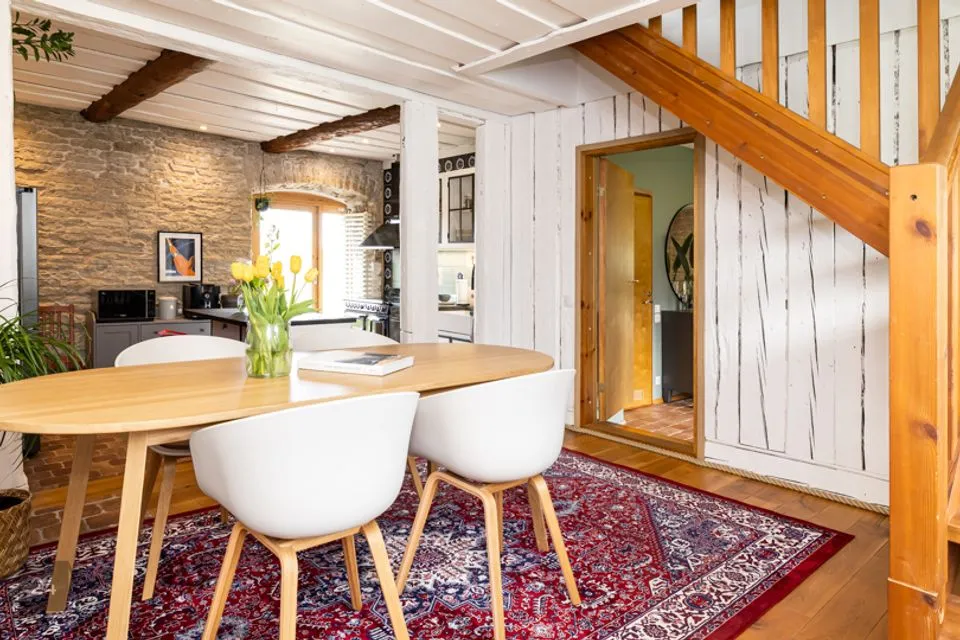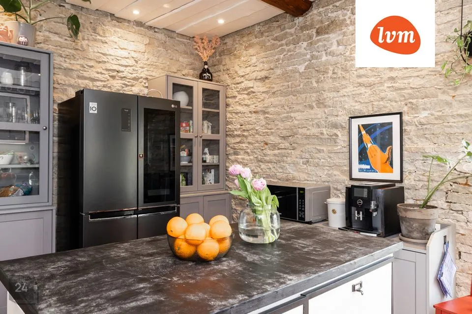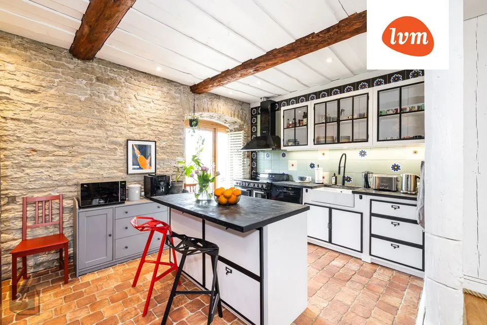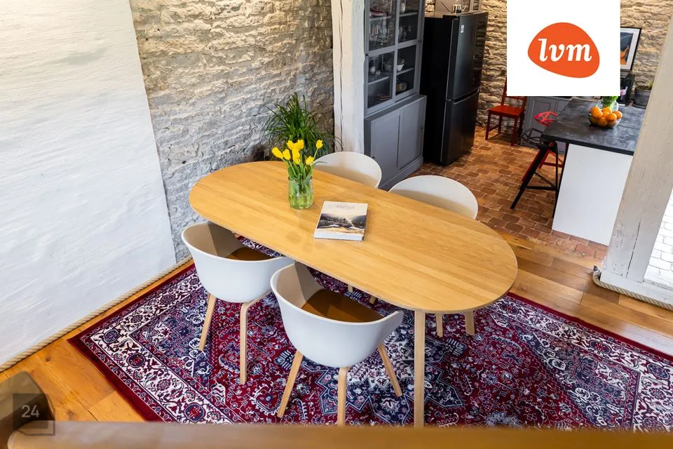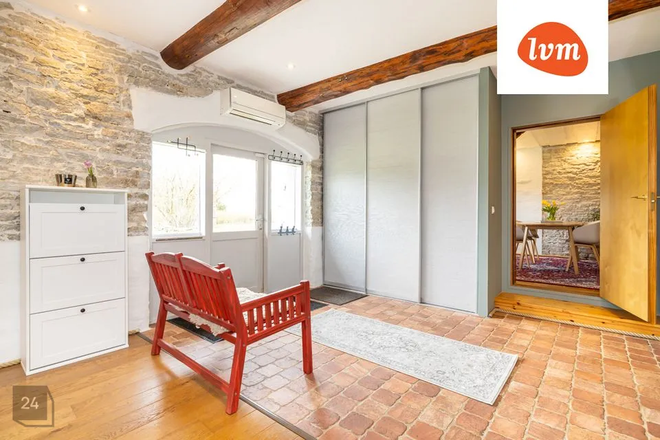 Maja välisseinad on osaliselt paekivist ning osaliselt vana palksein.