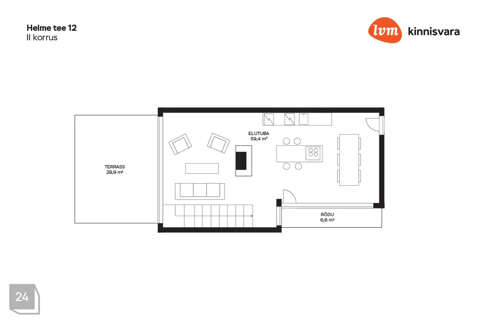 Elutuba avatud köögiga asub teisel korrusel, kust pääs ka 28,9m2 merevaatega terrassile.