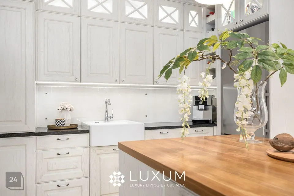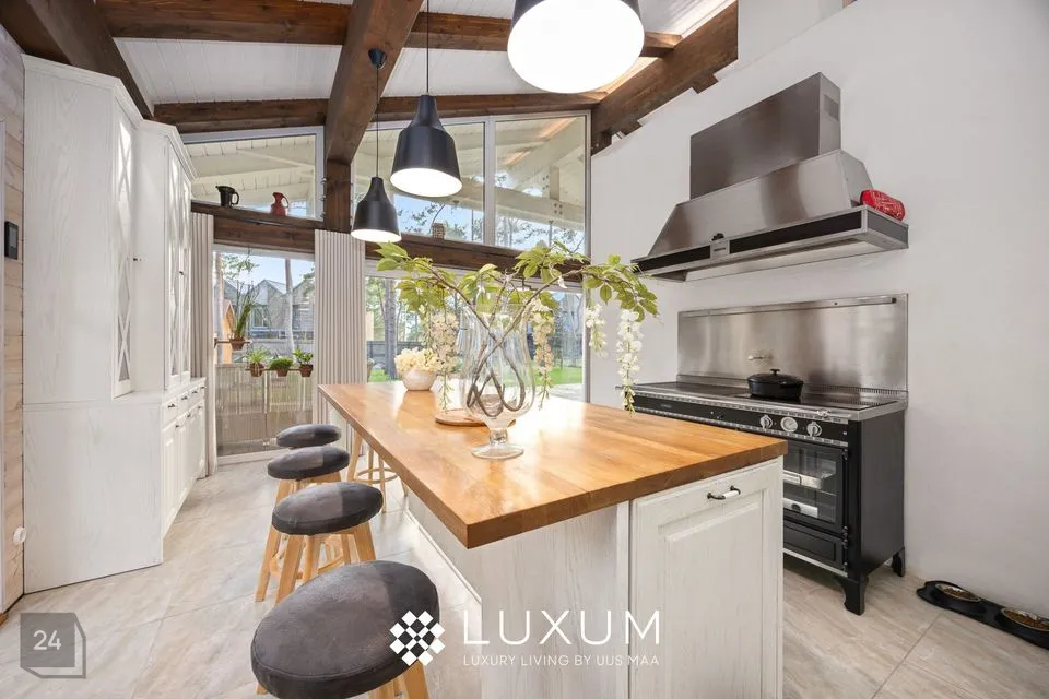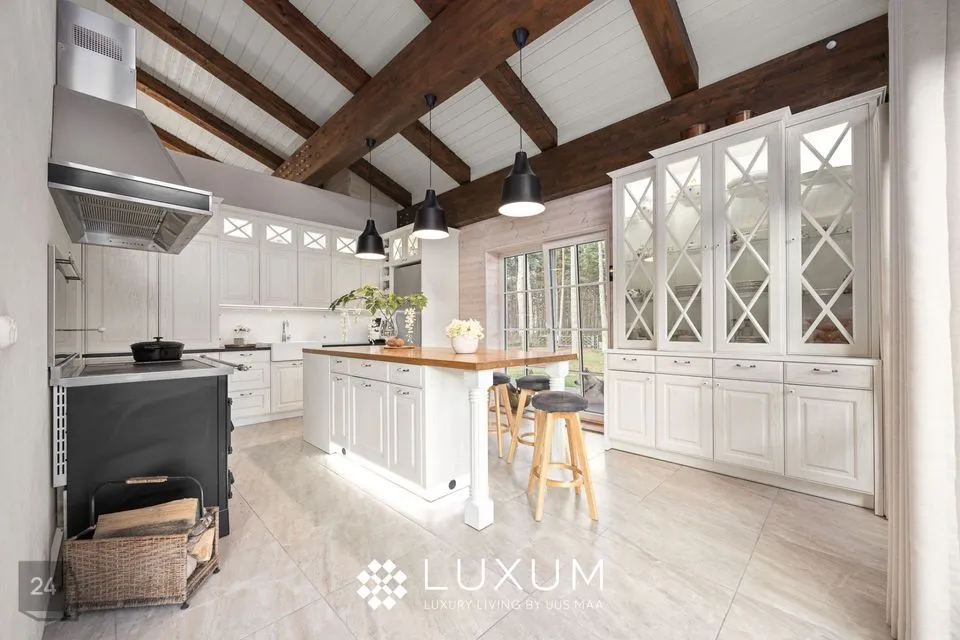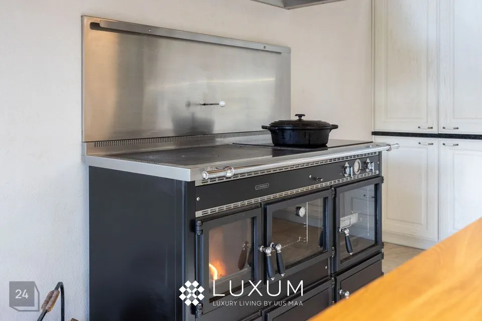 Köök on selle kodu süda - helge täispuidust sisustus ja ruumikas köögisaar, loovad funktsionaalse töökeskkonna, samas kui ainulaadne J. Corradi universaalne puidu ja elektriahi/pliit, toob ruumi romantilise kodusoojuse ja traditsiooni.