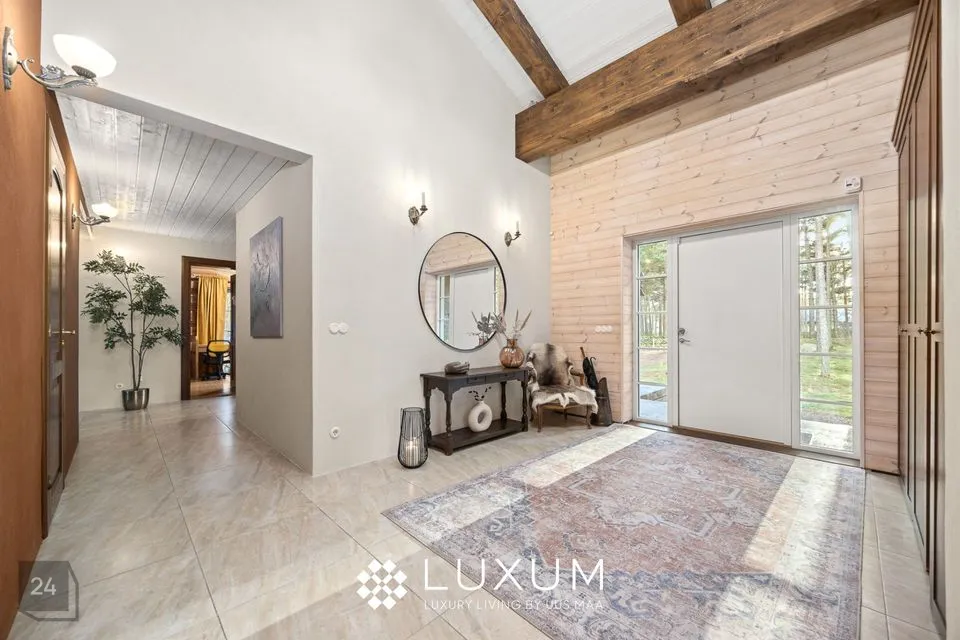 Koju jõudes avaneb kohe uksel esimene muljetavaldav vaatepilt - 5,5 meetri kõrgused laed ja õhuline avarus, mis voolab esikust edasi elutuppa ühe sujuva liikumisega.