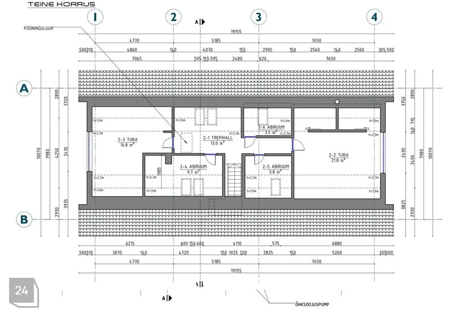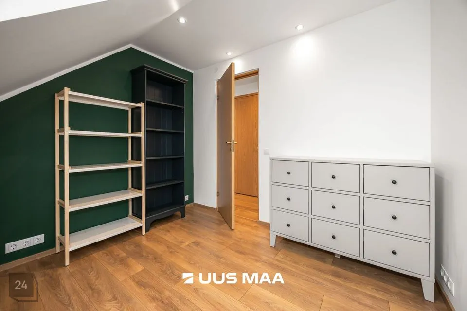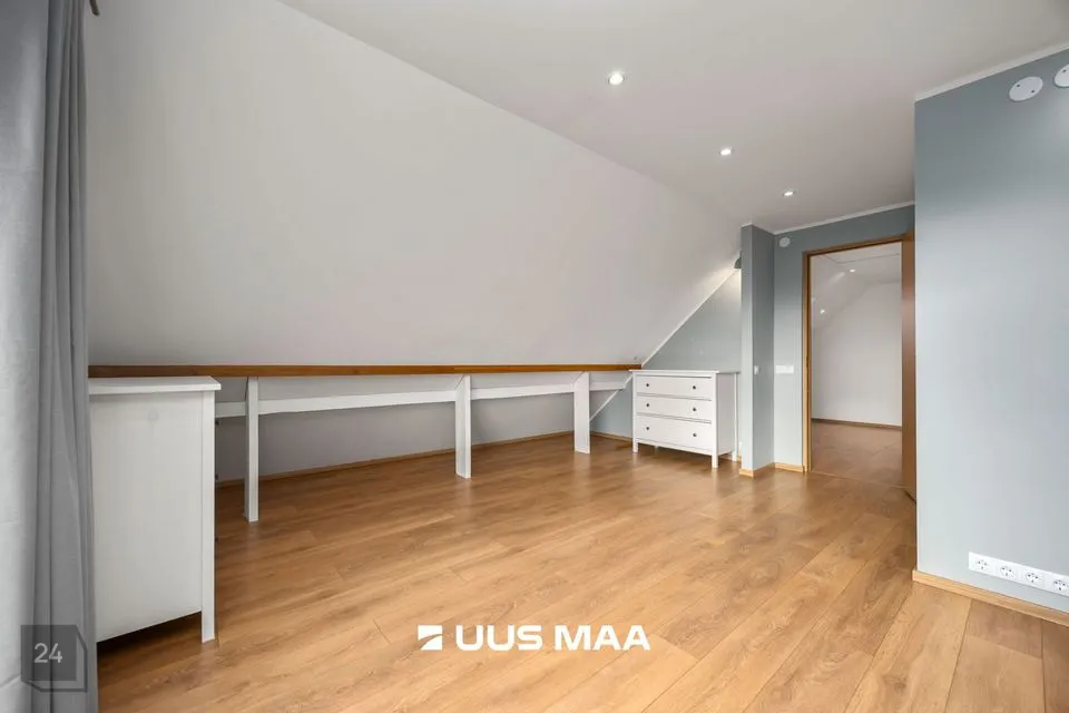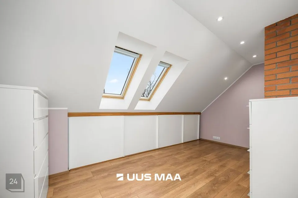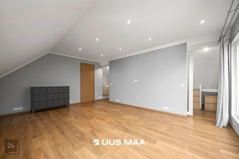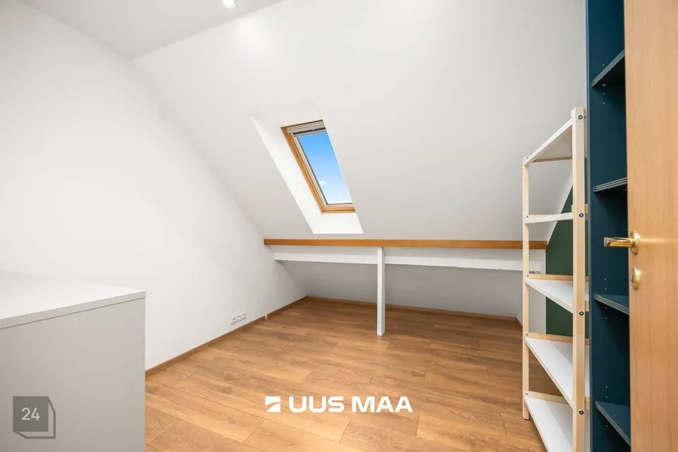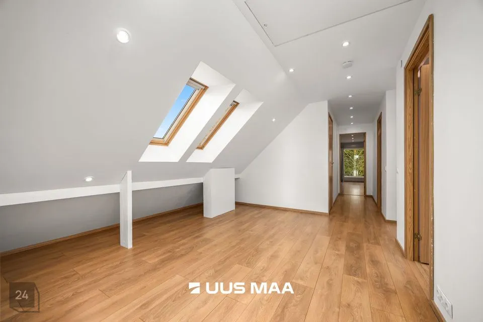 Teisel korrusel paiknevad kolm suuremat magamistuba, kompaktne kontori-/külalistetuba ning teine vannituba, mille keskmes on efektne kivivann. Otsapoolsetes tubades avanevad maast-lähiste akende kaudu vaated ümbritsevale loodusele; suurimas magamistoas on kaks sisse-ehitatud garderoobi. Katuseäärealused on nutikalt kasutusse võetud panipaikadena – kokku ligikaudu 30 m².