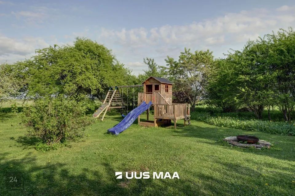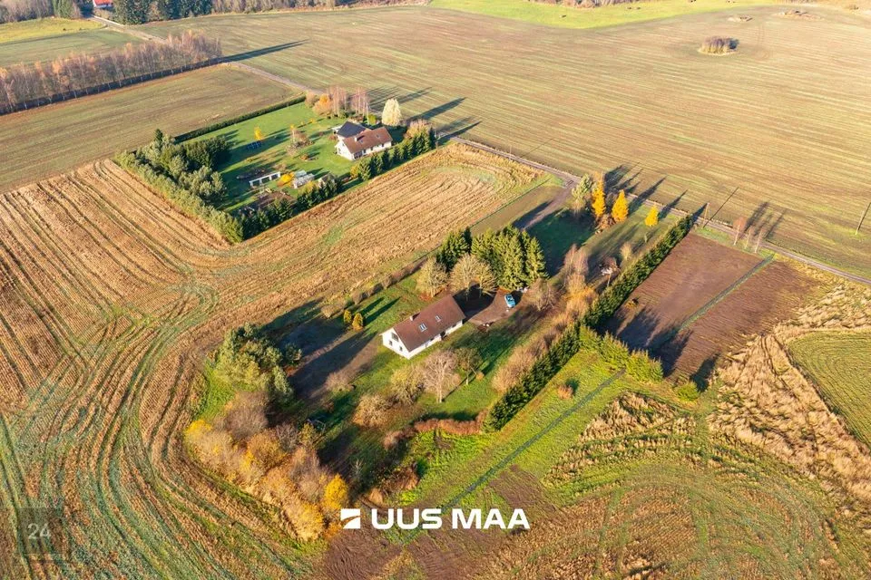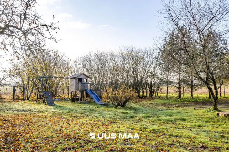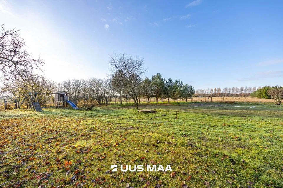 Kodu pakub haruldast privaatsust ja vaikust: ühel küljel paikneb naaber u 200 meetri kaugusel, ülejäänud külgedelt ümbritsevad kinnistut põllumaad.. Umbkaudu 1-hektarilisel hoovialal niidab muru Husqvarna robotniiduk; ruumi jätkub nii laste mänguks kui ka viljapuude ja -põõsaste saagi nautimiseks (õunad, pirnid, ploomid, kirsid, vaarikad, põldmarjad, mustsõstrad). Uuele omanikule jäävad muruniiduk, lumefrees, aiatööriistade komplekt ning tünnisaun. Hoovi turvalisust ja mugavust lisavad piirdeaed ja automaatikaga avatavad väravad. Piltidel olev mööbel ja tehnika on hinna sees.