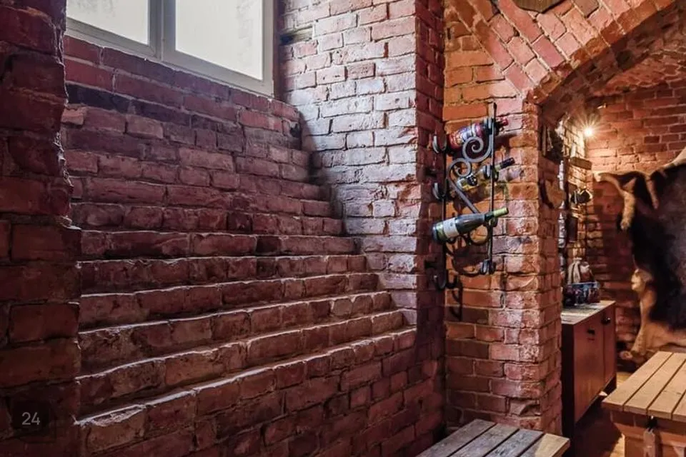 Maakividest sokliga ning puhta vuugiga laotud tellistest häärberi peasissekäiku rõhutab kahe kaaraknaga keskrisaliit. Keldris on jahisaal ehk kaminatuba, seintel jahitrofeed. Ruumi jagab seal pooleks võlvkaar. Ühes osas on uutest, nn Aseri punastest tellistest kamin, teine ruumiosa külgneb saunaga. Saunalavalt avaneb klaasakna kaudu vaade kaminale, nii et laval soojas istudes saab ka elavat tuld nautida. Kalasaba mustriga keldrilagi on omaette vaatamisväärsus. Aknaalused seinad meenutavad treppi – rida-realt läheb tellissein järjest õhemaks. Selliselt laotud sein aitab valgusel paremini ruumi pääseda. Muude ruumide kõrval on keldris ka n-ö jahimehe köök, kus jahilt tulijad saavad saagiga omapäi toimetada. 500 m² võlvlaega täiskelder + 450 m² madal kelder, töötuba, leiliruum, pesuruum. 2 väiksemat keldriruumi, lisaks asub keldrikorrusel köök, katlaruum, puuhoidla, koridor, kõikjal võlvkaared 2,7 m kõrguste võlvlagedega, eraldi sissepääsud 1 väljast ja 1 seest.