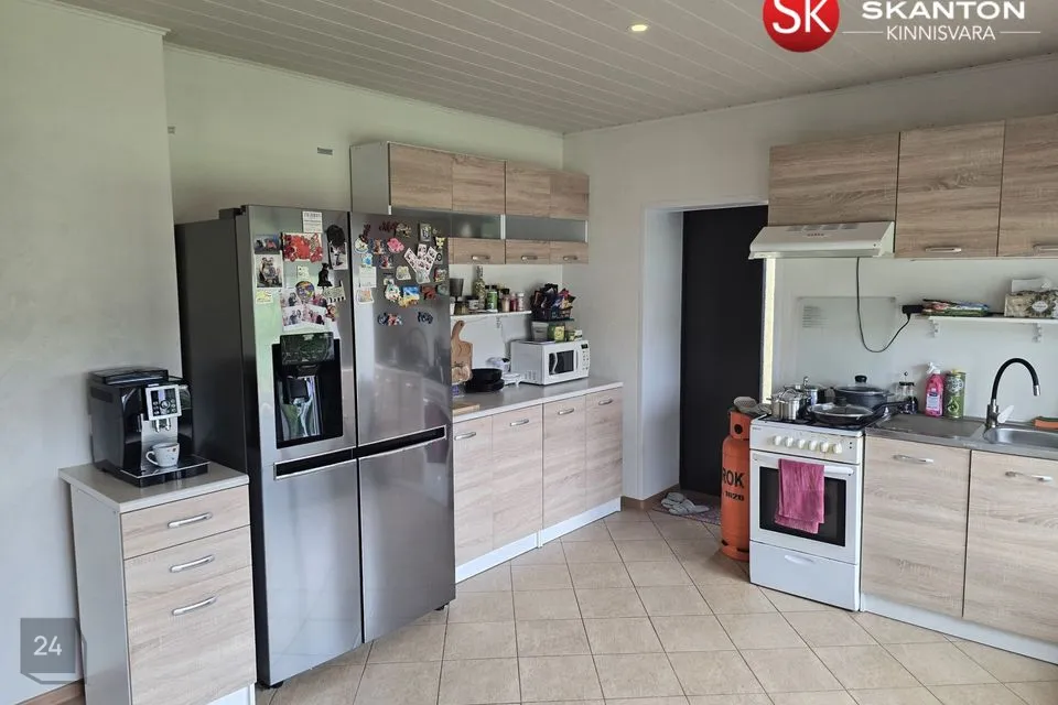 Köögis on korralik köögimööbel, gaasipliit koos küpsetusahjuga, õhupuhasti ja külmik.