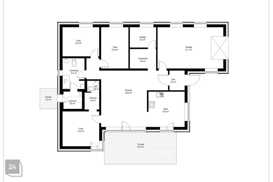 Planeeringult kuuluvad elamu koosseisu järgmised ruumid: esik; avar elutuba; köök; suur magamistuba koos garderoobi ja wc-ga; keskmine magamistuba; väike magamistuba; kabinet; suur garderoob; vannituba-wc; leiliruum ja garaaž. Köögist, elutoast ja suurest magamistoast pääseb maja küljele avanevale varjualusega terrassile (27,4 m2). Leiliruumist pääseb maja taha avanevale väikesele terrassile (4,1 m2). Üldpinnast 184,6 m2 moodustab köetav pind 157,6 m2 ja kaks terrassi kokku 31,6 m2.