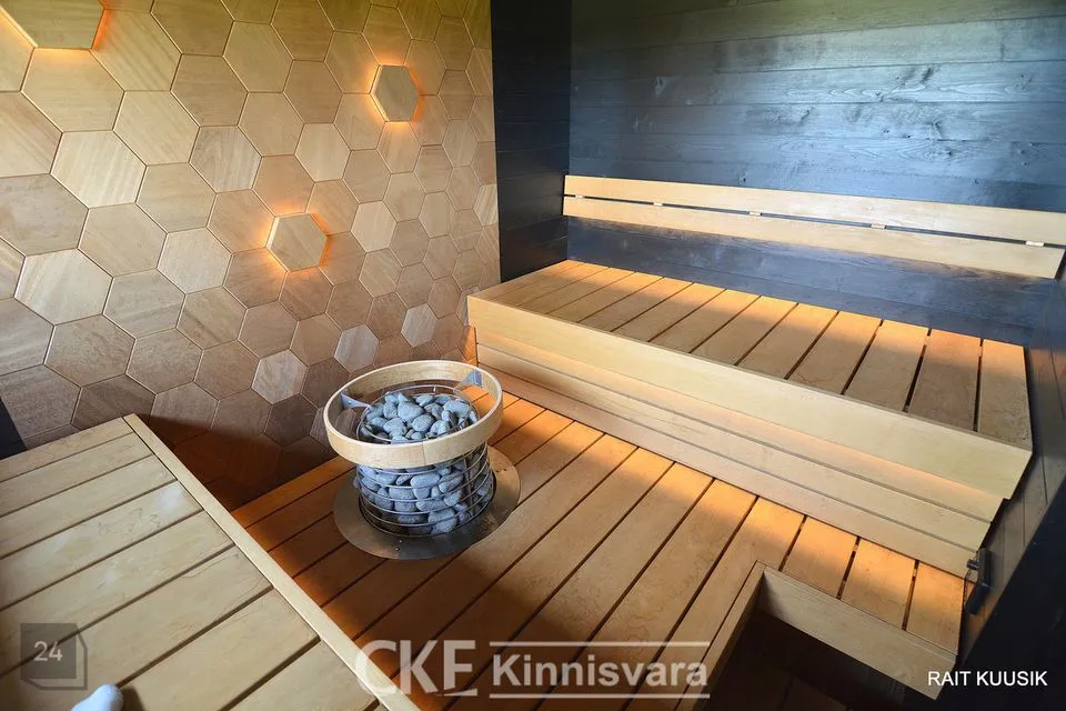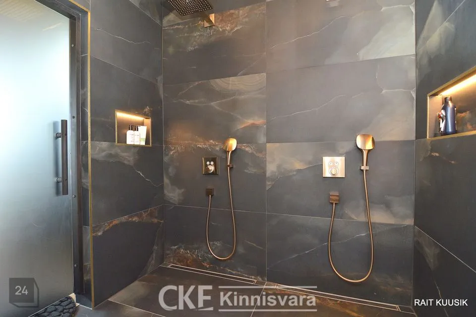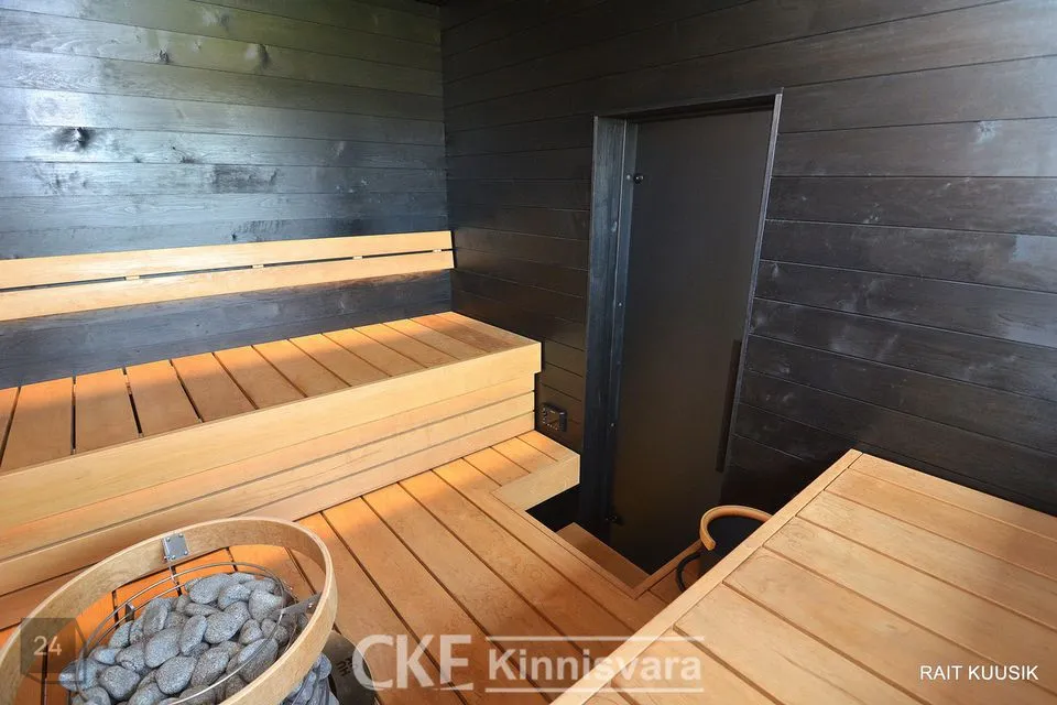 Suure magamistoa koosseisu kuulub privaatne vannituba-wc ja walk-in garderoob. Saunakomleksi kooseisu kuuluvad puhkeruum, pesuruum, aurusaun (veel viimistlemata), leiliruum ja majapidamisruum-wc. Elutoast, suurest magamistoast ja sauna eesruumist pääseb suurele lõuna-läänepoolsele terrassile. Terrassil on süvendiga gillimisala. Üldpinnast 374,9 m2 moodustab köetav pind 233,3 m2 ja terrass 141,6 m2. Majas on kokku 3 pesuruumi ja 4 wc-d.