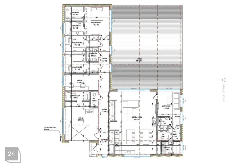 Kõrgete lagedega ühetasapinnaline planeering. Planeeringu kooseisu kuuluvad avar elutuba koos avatud köögiga, 4 magamistuba suurustega 11,9 - 28,2 m2, saunakompleks koos majapidamisruumiga, eraldi duširuum, eraldi wc, avar koridor, esik, garaaž ja tehnoruum.
