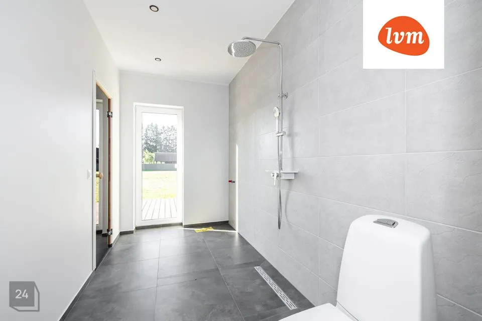esik, kuhu saab hästi paigaldada garderoobikapi; eraldi wc; suur avatud elutuba-köök; pesuruum koos leiliruumiga (elektrikeris); majapidamisruum ning kolm magamistuba.