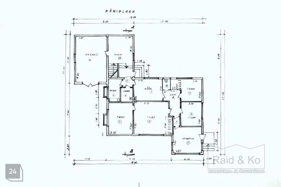 elutuba 24,4 m², 3 magamistuba 16,0 m², 9,9 m², 11,2 m², köök 12,3 m², veranda/suvetuba 16,2 m², vannituba 5,9 m², wc 1,5 m², leiliruum 3,1 m², 2 esikut 2,8 m² ja 7,6 m², panipaik 1,5 m², eluruumide osa kokku 111,1 m², lisaks garaaž 31,7 m² ja abiruum 22,6 m², keldrikorrusel kelder 12,0 m² ja katlarruum 12,0 m².