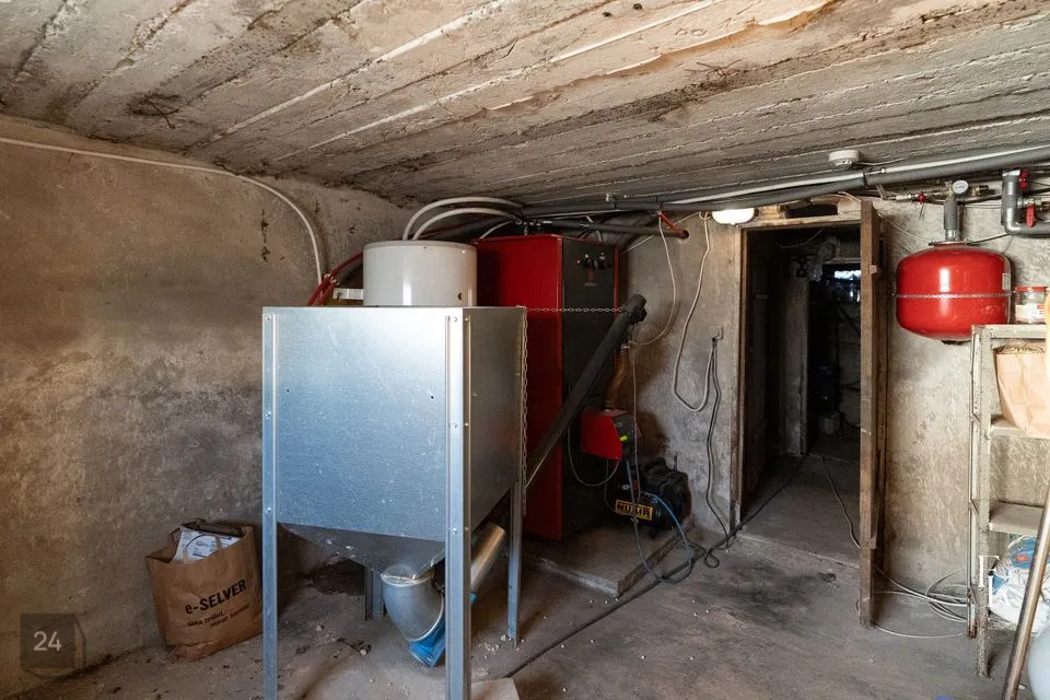 - Kütteruum (maja alusest ca pool), kus paikneb pelletikatel, mis tagab kogu majale efektiivse kütte. Esimesel korrusel on vesipõrandaküte, teisel korrusel radiaatorid. Katel võib soovi korral töötada ka vaid elektri peal.