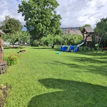 Aias on olemas mängumajaga laste mänguväljak, istumisnurk koos lõkkekohaga ja väike aiamaanurk kus asub ka kasvuhoone. On vanemaid viljapuid ja ka istutatud nooremaid.