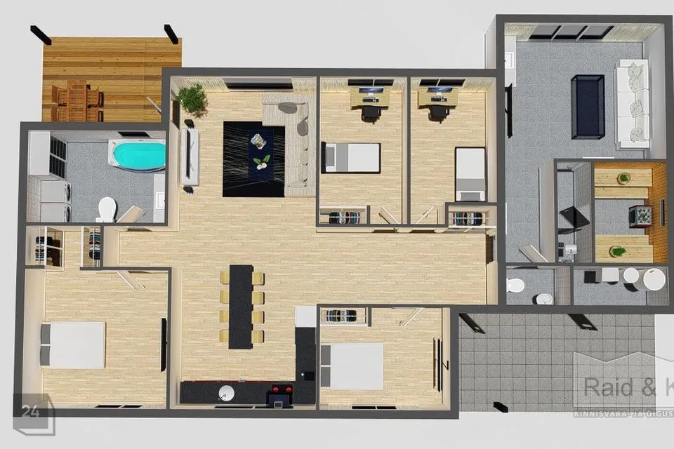 kolm väiksemat tuba asuvad sissepääsu juures, peamine magamistuba maja eraldi tiivas.