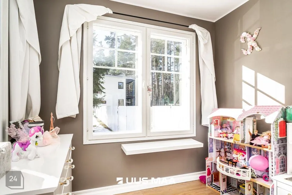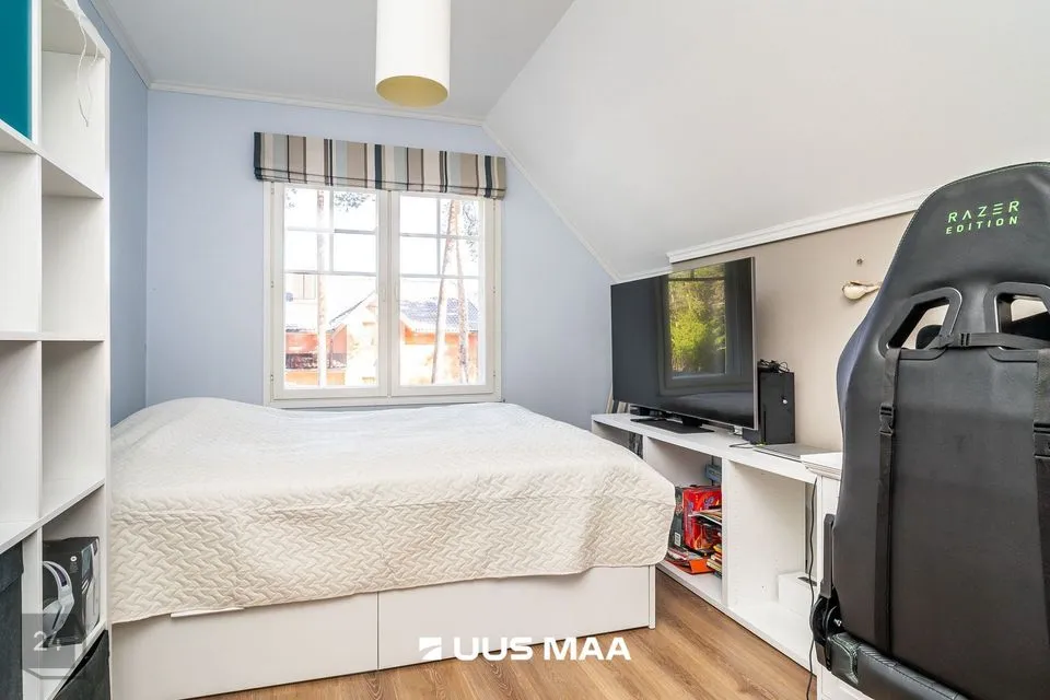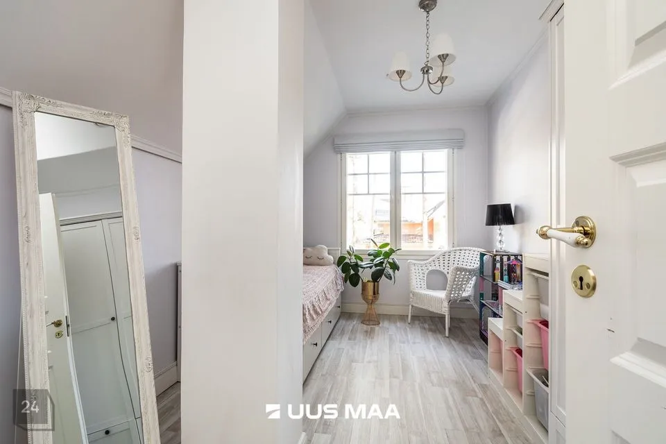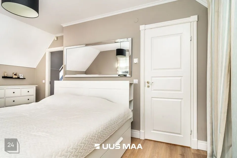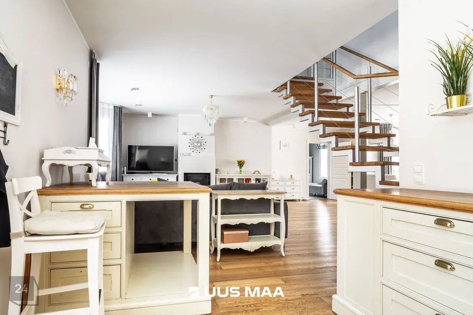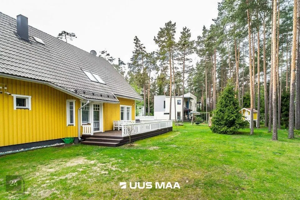 Kinnistul on kahekorruseline viilkatusega tibukollane Bullerbylik eramu. Eramu esimese korrusel on elutuba-söögituba-avatud köök (kogupinnaga 49 m2), kontorituba-mängutuba (8,2 m2), sisseastutav garderoob, külalistualettruum, esik, trepihall, majapidamisruum-tualettruum-duširuum, leiliruum ning garaaž (24 m2) ja tehnoruum. Teisel korrusel on kolm magamistuba (vastavalt 17,1 m2, 12,7 m2 ja 12,4 m2), trepihall ning duširuum-tualettruum, kuhu soovi korral saab pere pisemate rõõmuks paigaldada ka vanni. Eramu planeering on läbimõeldud ja funktsionaalne ning sobilik ka mitmelapselisele perele. Peamine magamistuba asub lastetubadest teises majatiivas ja on otsepääsuga sanruumi. Pesemisvõimalus maja mõlemal korrusel hoiab ära suure pere hommikuprotseduuride järjekorrad Maja planeeringus on arvesse võetud päikese liikumist ning seeläbi maksimaalselt ära kasutatud loomulikku valgust. Maja siseviimistlust värskendati kaks aastat tagasi. Maja müüakse koos kohtkindla sisustusega, muu sisutuse osas võimalikud erikokkulepped.