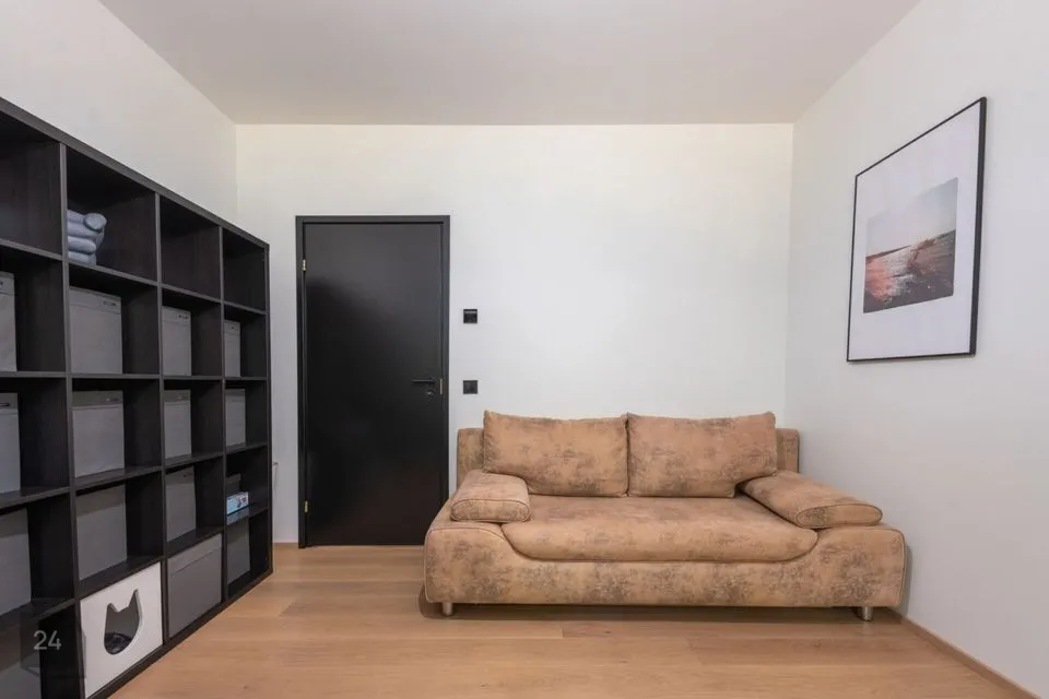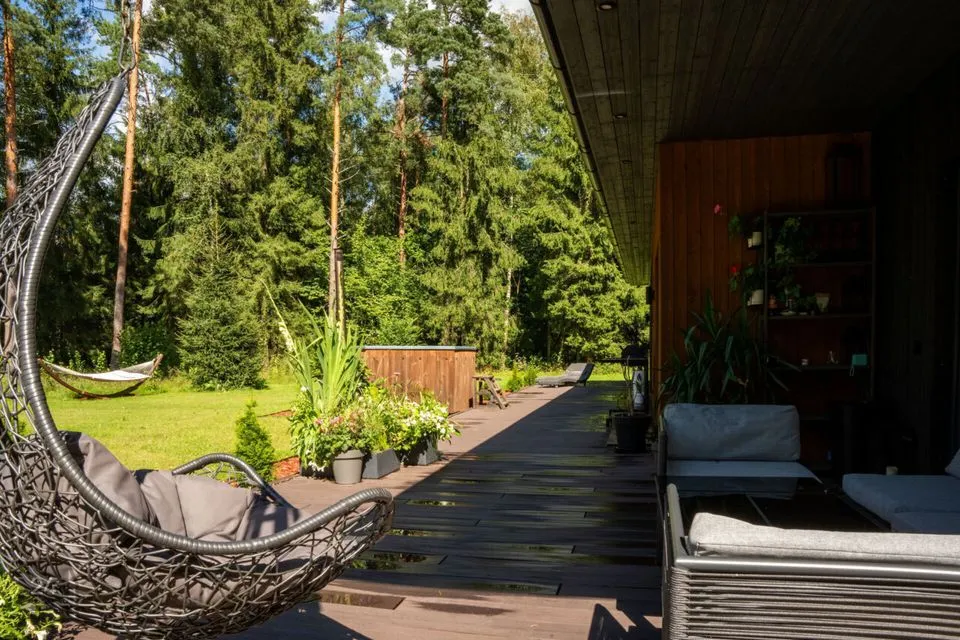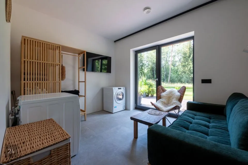 Living Room: large corner sofa (natural filling), storage cabinets, access to terrace and forest view